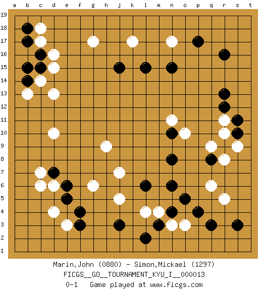Last move : 0-1 2009 April 27 16:13:10 [Event "FICGS__GO__TOURNAMENT_KYU_I__000013"] [Site "FICGS"] [Date "2009.01.30"] [Round "1"] [Black "Marin,John"] [White "Simon,Mickael"] [Result "0-1"] [Rating 1 "0880"] [Rating 2 "1297"] 1.r16 d4 2.q3 d16 3.p17 r10 4.r13 r5 5.p4 q6 6.s3 k17 7.j15 g17 8.l15 n3 9.j3 l4 10.o5 j5 11.n6 d10 12.q8 r8 13.l2 n17 14.m3 m4 15.n4 o3 16.f3 e3 17.f4 c6 18.n15 o10 19.c16 c17 20.c15 d15 21.b17 c18 22.b18 c14 23.b14 b13 24.b15 d13 25.d7 c7 26.l6 j7 27.s10 s9 28.s11 r11 29.r12 q9 30.n8 g6 31.e5 d6 32.e6 h9 33.n10 n11 0-1 This go game has been lost on time (started : 2009.01.30 2:46:35) Here are the names of the openings (joseki) played in the four corners : Corner q4 : q3 r5 Komoku (Somok, Xiao~mu`) 3-4 Point. The komoku (3-4) point is the traditional corner enclosure move.. Ikken Kakari (Hankan Keolch'im, Yi Gua`jiao~, 1-Space Low Pincer). The small knight move is the basic approach move to the 3-4 point stone. It has been continually used for over four centuries. There are limitless variations, with new moves constantly being discovered. White 2 opens the door to a treaure store of joseki. Corner d16 : d16 j15 Hoshi (Hwajeom, Seongjeom, Xingwei`) 4-4 Point. The star or hoshi (4-4) point, emphasizing influence at the potential expense of territory. Corner d4 : d4 j3 Hoshi (Hwajeom, Seongjeom, Xingwei`) 4-4 Point. The star or hoshi (4-4) point, emphasizing influence at the potential expense of territory. Player White won this Go (weiqi, baduk) game. Follow this game move after move (download)Those who are good at winning, don't usually fight. (Zhang) Perseverance does not equal worthiness. Next time you want to get my attention, wear something fun. Low-riding jeans are hot. (Gregory House, House M.D.)