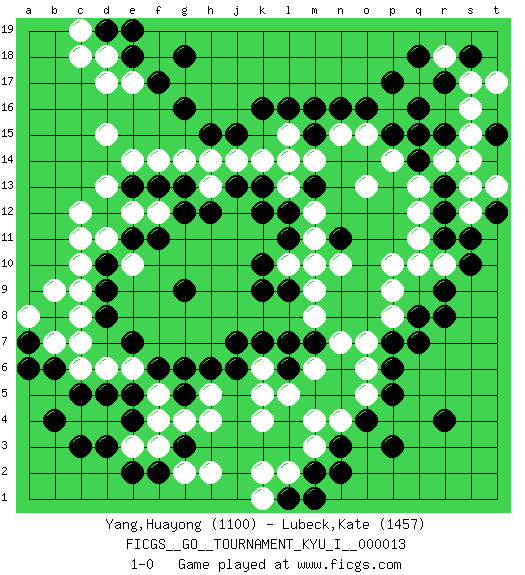 Last move : 1-0 2009 May 6 18:13:19 [Event "FICGS__GO__TOURNAMENT_KYU_I__000013"] [Site "FICGS"] [Date "2009.01.30"] [Round "1"] [Black "Yang,Huayong"] [White "Lubeck,Kate"] [Result "1-0"] [Rating 1 "1100"] [Rating 2 "1457"] 1.q16 d4 2.r4 d17 3.p3 c11 4.g16 d15 5.k16 k4 6.c3 c4 7.d3 e3 8.e2 f3 9.f2 g2 10.g3 h2 11.b4 c6 12.e4 f4 13.e5 f5 14.c5 e6 15.d5 d6 16.f6 h4 17.d8 c8 18.g6 h5 19.e7 c7 20.d9 c10 21.g9 f14 22.d12 d11 23.e11 e12 24.e13 f12 25.f13 d13 26.g12 c12 27.f11 e14 28.g13 r14 29.r12 p14 30.o16 s16 31.r17 s17 32.s18 s13 33.r15 s15 34.q14 q13 35.q15 q12 36.r13 s14 37.r11 s12 38.s11 t17 39.t12 t13 40.t15 p10 41.r8 m12 42.m16 m8 43.q7 r10 44.s10 q11 45.r9 q10 46.f17 n4 47.n2 m3 48.j7 k6 49.k9 l10 50.l9 m9 51.k10 g14 52.j13 k14 53.h15 h14 54.e18 d18 55.d19 c19 56.e19 c18 57.j15 j14 58.b6 b7 59.a7 b9 60.l11 m11 61.m10 n10 62.p5 o6 63.k7 q17 64.p17 r18 65.q18 n15 66.n16 l15 67.l16 o15 68.l7 m6 69.m2 l2 70.n3 m4 71.k13 l13 72.l12 h13 73.h12 p8 74.m7 n7 75.m13 l14 76.n11 l10 77.k12 m10 78.j6 k5 79.m15 m14 80.p15 o13 81.l1 k1 82.m1 k2 83.p6 o5 84.o4 a8 85.a6 c9 86.p7 o7 87.q8 p9 88.l6 l5 89.g5 g4 90.h6 e10 91.d10 e17 92.g18 1-0 Here are the names of the openings (joseki) played in the four corners : Corner d4 : d4 c3 Hoshi (Hwajeom, Seongjeom, Xingwei`) 4-4 Point. The star or hoshi (4-4) point, emphasizing influence at the potential expense of territory. Corner q16 : q16 r14 Hoshi (Hwajeom, Seongjeom, Xingwei`) 4-4 Point. The star or hoshi (4-4) point, emphasizing influence at the potential expense of territory. Ikken Kakari (Hankan Keolch'im, Yi Gua`jiao~, 1-Space Low Approach). White 2 is the standard approach move to the 4-4. Player Black won this Go (weiqi, baduk) game. Follow this game move after move (download)Corner, side, centre. (Anonymous) Always two there are. No more no less. A master, and an apprentice. (Master Yoda in Star Wars ep.1)