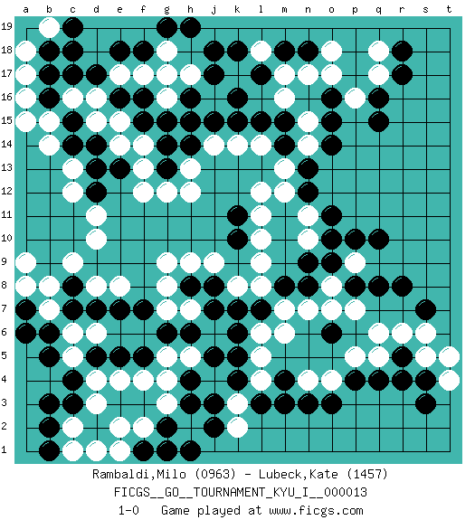 Last move : 1-0 2009 August 26 18:45:59 [Event "FICGS__GO__TOURNAMENT_KYU_I__000013"] [Site "FICGS"] [Date "2009.01.30"] [Round "1"] [Black "Rambaldi,Milo"] [White "Lubeck,Kate"] [Result "1-0"] [Rating 1 "0963"] [Rating 2 "1457"] 1.q16 d4 2.q4 d16 3.q10 d10 4.k4 o17 5.o15 m16 6.k10 h12 7.c17 c16 8.d17 e17 9.e18 f17 10.f18 g17 11.b16 b15 12.b17 g18 13.c15 b14 14.c14 c13 15.e16 d15 16.d14 e15 17.f16 e14 18.d13 c12 19.e13 g16 20.f15 f14 21.g15 h15 22.g14 f13 23.g13 f12 24.h14 j14 25.j15 j16 26.h16 h17 27.j17 h15 28.k15 h13 29.h16 d18 30.k16 g12 31.h15 e19 32.c18 f19 33.j18 a18 34.e18 d19 35.c19 a17 36.h19 a16 37.g19 b19 38.f18 q18 39.r18 q17 40.r17 p16 41.q15 g3 42.o16 m17 43.n18 o18 44.m18 l18 45.l17 n17 46.k18 l14 47.l15 k14 48.m14 l12 49.o3 r6 50.r5 q6 51.r8 o7 52.o9 m6 53.n8 n7 54.k6 n4 55.n3 o4 56.m3 s5 57.s4 t5 58.s7 s6 59.q8 l8 60.l7 m7 61.m8 g9 62.p4 p5 63.o6 l6 64.k7 l5 65.k5 p7 66.m4 p9 67.p8 o8 68.n9 l4 69.l3 k3 70.j3 k2 71.j2 l9 72.p10 l10 73.c3 d3 74.c4 c5 75.b5 c6 76.b6 b7 77.d2 e2 78.c7 b8 79.d5 d6 80.c8 c9 81.e5 f4 82.e7 c2 83.b2 d1 84.k11 l11 85.n12 k8 86.f5 e4 87.j8 j9 88.h8 h9 89.h4 g7 90.h6 h7 91.j7 g8 92.g6 e8 93.d7 d8 94.b18 a15 95.d12 d11 96.a7 a9 97.b1 c1 98.f1 g1 99.g2 f2 100.h1 g4 101.h3 g5 102.f7 h5 103.j5 m13 104.n13 n10 105.o10 n11 106.o11 m12 107.g1 e1 108.a6 a8 109.b3 n14 110.m15 n15 111.o14 t4 112.s3 q5 113.r4 1-0 Here are the names of the openings (joseki) played in the four corners : Corner q16 : q16 o17 Hoshi (Hwajeom, Seongjeom, Xingwei`) 4-4 Point. The star or hoshi (4-4) point, emphasizing influence at the potential expense of territory. Ikken Kakari (Hankan Keolch'im, Yi Gua`jiao~, 1-Space Low Approach). White 2 is the standard approach move to the 4-4. Player Black won this Go (weiqi, baduk) game. Follow this game move after move (download)Use a wall to attack, not to make territory. (Anonymous) It's not the will to win, but the will to prepare to win that makes the difference. (Bear Bryant)