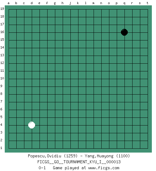 Last move : 0-1 2009 March 2 9:58:42 [Event "FICGS__GO__TOURNAMENT_KYU_I__000013"] [Site "FICGS"] [Date "2009.01.30"] [Round "1"] [Black "Popescu,Ovidiu"] [White "Yang,Huayong"] [Result "0-1"] [Rating 1 "1259"] [Rating 2 "1100"] 1.q16 d4 0-1 This go game has been lost on time (started : 2009.01.30 2:46:35) Here are the names of the openings (joseki) played in the four corners : Corner d4 : d4 0-1 Hoshi (Hwajeom, Seongjeom, Xingwei`) 4-4 Point. The star or hoshi (4-4) point, emphasizing influence at the potential expense of territory. Player White won this Go (weiqi, baduk) game. Follow this game move after move (download)Everything would seem to be possible in Go. Like pulling a rabbit, by a magical move, out of a hat. (Pierre Audouard) But they are useless. They can only give you answers. (Pablo Picasso, about computers)