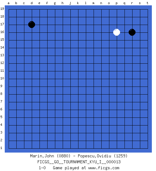 Last move : 1-0 2009 March 2 9:58:42 [Event "FICGS__GO__TOURNAMENT_KYU_I__000013"] [Site "FICGS"] [Date "2009.01.30"] [Round "1"] [Black "Marin,John"] [White "Popescu,Ovidiu"] [Result "1-0"] [Rating 1 "0880"] [Rating 2 "1259"] 1.r16 p16 2.d17 1-0 This go game has been lost on time (started : 2009.01.30 2:46:35) Here are the names of the openings (joseki) played in the four corners : Corner q16 : r16 p16 Komoku (Somok, Xiao~mu`) 3-4 Point. The komoku (3-4) point is the traditional corner enclosure move.. Ikken Takagakari (Hankan Nop'dakeolch'im, Yi Gaogua`jiao~, 1-Space High Approach). The 5-4 approach move has become more popular in modern times, as modern Go emphasizes speed and influence. Player Black won this Go (weiqi, baduk) game. Follow this game move after move (download)Good moves and bad moves are bedfellows. (Anonymous) The problem with manipulation is that people can turn on you. (Horatio Caine, C.S.I. Miami)