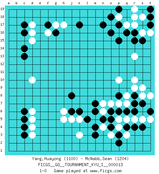 Last move : 1-0 2009 February 16 8:59:25 [Event "FICGS__GO__TOURNAMENT_KYU_I__000013"] [Site "FICGS"] [Date "2009.01.30"] [Round "1"] [Black "Yang,Huayong"] [White "McNabb,Sean"] [Result "1-0"] [Rating 1 "1100"] [Rating 2 "1204"] 1.q16 d4 2.r4 d16 3.p3 d10 4.f17 h17 5.c14 f16 6.g16 g17 7.c17 d17 8.c16 d15 9.c13 r10 10.r8 r13 11.r15 p10 12.n17 k3 13.c3 d3 14.c4 d5 15.c5 d6 16.m3 k5 17.c6 p5 18.p8 r5 19.q4 q7 20.r7 q8 21.q6 q5 22.p6 p7 23.r6 s5 24.o5 p4 25.o4 q3 26.s4 o3 27.p2 n4 28.n5 m5 29.m4 n6 30.o6 o7 31.m6 n7 32.l5 r9 33.k6 j5 34.j6 h5 35.m7 h6 36.j8 q17 37.p17 p16 38.o16 p18 39.p15 r17 40.o18 r18 41.p19 s16 42.s15 s18 43.t17 t16 44.t18 r19 45.t19 s8 46.s7 s9 47.r16 t5 48.t6 t8 49.k17 1-0 Here are the names of the openings (joseki) played in the four corners : Corner d16 : d16 f17 Hoshi (Hwajeom, Seongjeom, Xingwei`) 4-4 Point. The star or hoshi (4-4) point, emphasizing influence at the potential expense of territory. Ikken Kakari (Hankan Keolch'im, Yi Gua`jiao~, 1-Space Low Approach). Black 2 is the standard approach move to the 4-4. Corner q16 : q16 r13 Hoshi (Hwajeom, Seongjeom, Xingwei`) 4-4 Point. The star or hoshi (4-4) point, emphasizing influence at the potential expense of territory. Nikken Kakari (Dukan Keolch'im, E`r Gua`jiao~, 2-Space Low Approach). Black typically answers by 7-3 or 3-5 (which is not joseki). Corner d4 : d4 c3 Hoshi (Hwajeom, Seongjeom, Xingwei`) 4-4 Point. The star or hoshi (4-4) point, emphasizing influence at the potential expense of territory. Player Black won this Go (weiqi, baduk) game. Follow this game move after move (download)Territory really exists only in the end. (Pierre Audouard) When a man with money meets a man with experience, the man with experience leaves with money and the man with money leaves with experience. (Anonymous)