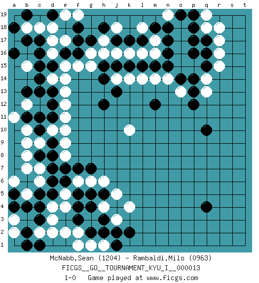 Last move : 1-0 2009 March 25 15:1:45 [Event "FICGS__GO__TOURNAMENT_KYU_I__000013"] [Site "FICGS"] [Date "2009.01.30"] [Round "1"] [Black "McNabb,Sean"] [White "Rambaldi,Milo"] [Result "1-0"] [Rating 1 "1204"] [Rating 2 "0963"] 1.q16 d4 2.q4 d16 3.f17 d10 4.l17 k4 5.q10 k10 6.c14 d14 7.d13 e14 8.c15 e13 9.d12 e12 10.d11 e11 11.c10 c9 12.c11 k16 13.k17 j16 14.j17 h16 15.g17 h17 16.h18 l16 17.d15 e15 18.e16 e17 19.f16 d17 20.b17 b18 21.c17 m17 22.m18 j18 23.f18 l18 24.n17 m16 25.n18 o15 26.d9 e10 27.d8 b9 28.d6 c7 29.d7 b7 30.c5 c6 31.d5 b5 32.c4 d3 33.c3 c2 34.b2 d2 35.b4 a6 36.c8 b8 37.b1 a3 38.a4 a2 39.a5 b10 40.b11 a11 41.b13 b12 42.c13 o17 43.n16 o16 44.n15 n14 45.m15 m14 46.l15 k14 47.k15 g15 48.j15 j14 49.h15 g16 50.h14 o18 51.h12 l14 52.j13 n19 53.o14 o13 54.p14 p15 55.q15 q14 56.p13 q13 57.p12 r17 58.q17 q18 59.p18 r18 60.p19 q19 61.p17 r15 62.o19 r16 63.p16 c18 64.c16 e19 65.m12 a17 66.a16 b15 67.a18 f19 68.b19 d18 69.d19 f15 70.g5 e5 71.e6 f6 72.f5 e4 73.f3 g3 74.f4 f2 75.g2 e2 76.h3 g1 77.h2 h1 78.j1 f1 79.k2 e9 80.c1 e8 81.f7 g6 82.g7 h6 83.e7 h4 84.h5 j5 85.g4 j3 86.j2 1-0 Here are the names of the openings (joseki) played in the four corners : Corner d16 : d16 f17 Hoshi (Hwajeom, Seongjeom, Xingwei`) 4-4 Point. The star or hoshi (4-4) point, emphasizing influence at the potential expense of territory. Ikken Kakari (Hankan Keolch'im, Yi Gua`jiao~, 1-Space Low Approach). Black 2 is the standard approach move to the 4-4. Player Black won this Go (weiqi, baduk) game. Follow this game move after move (download)Josekis are not fixed, definitive things. They indicate the moments when everything can change. (Pierre Audouard) Have no fear of perfection - you'll never reach it. (Salvador Dali)