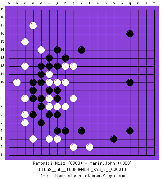 Last move : 1-0 2009 April 25 16:5:50 [Event "FICGS__GO__TOURNAMENT_KYU_I__000013"] [Site "FICGS"] [Date "2009.01.30"] [Round "1"] [Black "Rambaldi,Milo"] [White "Marin,John"] [Result "1-0"] [Rating 1 "0963"] [Rating 2 "0880"] 1.q16 d17 2.q4 d3 3.q10 c15 4.k4 c5 5.d10 c8 6.e8 c12 7.e5 f3 8.g4 f10 9.e11 f11 10.e12 g13 11.f12 h12 12.g12 e14 13.h13 e9 14.d9 f8 15.d8 e6 16.e7 f7 17.d6 c6 18.f6 b10 19.f13 h7 20.g6 j8 21.g8 g7 22.g9 h10 23.f9 j12 24.g14 g3 25.h4 j2 26.k14 l2 27.o3 g10 28.e10 1-0 This go game has been lost on time (started : 2009.01.30 2:46:35) Here are the names of the openings (joseki) played in the four corners : Corner q4 : q4 l2 Hoshi (Hwajeom, Seongjeom, Xingwei`) 4-4 Point. The star or hoshi (4-4) point, emphasizing influence at the potential expense of territory. Player Black won this Go (weiqi, baduk) game. Follow this game move after move (download)The simplest move is the best move. (Anonymous) There are 10 types of people in this world: those who understand binary and those who don't. (Anonymous)