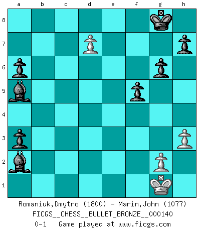 Last move : 0-1 2009 January 30 8:8:17 [Event "FICGS__CHESS__BULLET_BRONZE__000140"] [Site "FICGS"] [Date "2009.01.30"] [Round "1"] [White "Romaniuk,Dmytro"] [Black "Marin,John"] [Result "0-1"] [WhiteElo "1800"] [BlackElo "1077"] 1.d4 Nf6 2.c4 g6 3.Nc3 Bg7 4.e4 d6 5.f3 O-O 6.Be3 c5 7.d5 e6 8.Bd3 exd5 9.cxd5 a6 10.Nge2 Nbd7 11.Qd2 b5 12.O-O Ne5 13.a4 b4 14.Nd1 Nxd3 15.Qxd3 Nd7 16.a5 Ne5 17.Qc2 Bd7 18.Nf2 Bb5 19.Rfe1 Nc4 20.Bc1 Nxa5 21.f4 Nc4 22.Rb1 Re8 23.b3 Na3 24.Bxa3 bxa3 25.Nc3 Qa5 26.Na2 Bd4 27.Kh1 f5 28.e5 dxe5 29.fxe5 Bxe5 30.Qxc5 Bd4 31.b4 Rxe1+ 32.Rxe1 Bxc5 33.bxa5 Bxf2 34.Rd1 Re8 35.h3 Re1+ 36.Rxe1 Bxe1 37.Kg1 Bc4 38.d6 Bxa2 39.d7 Bxa5 0-1 King's Indian : Saemisch, 5...O-O Kingside Castling by player Black (move 5) Kingside Castling by player White (move 12) Player Black won this chess game. Follow this game move after move (download)An attack on the wing should be met by play in the center. (Nimzovitch) Ich bewundere Kasparows phantasievolle Angriffssiege aus den Achtzigern und Neunzigern, aber wenn man sie mit dem Computer überprüft, nimmt der Computer in jeder zweiten Partie die Opfer an, verteidigt sich und gewinnt. (Vladimir Kramnik) Un entendimiento a fondo de las continuaciones típicas del mate, hace de las combinaciones de sacrificio mas complicadas conducirlas a ellas no solo sin dificultad, sino casi de una manera natural. (Siegbert Tarrasch) RxDa4 pat (...) If things go wrong, don't go with them. (Roger Babson)