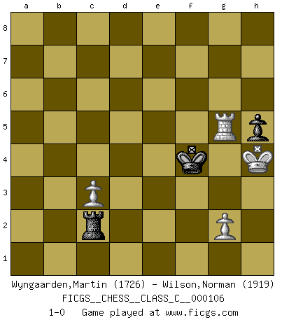 Last move : 1-0 2009 April 14 8:48:21 [Event "FICGS__CHESS__CLASS_C__000106"] [Site "FICGS"] [Date "2009.01.31"] [Round "1"] [White "Wyngaarden,Martin"] [Black "Wilson,Norman"] [Result "1-0"] [WhiteElo "1726"] [BlackElo "1919"] 1.e4 e5 2.Nf3 d6 3.d4 exd4 4.Nxd4 Nf6 5.Nc3 Bd7 6.Bc4 Nc6 7.O-O Be7 8.Nxc6 Bxc6 9.f3 a6 10.Be3 b5 11.Bb3 O-O 12.Qd2 Re8 13.Rfd1 Qb8 14.a4 Qb7 15.Bd4 Nd7 16.Bd5 Bf6 17.Bxc6 Qxc6 18.Nd5 Bxd4+ 19.Qxd4 Qb7 20.b4 Nf8 21.axb5 axb5 22.Rxa8 Rxa8 23.Qc3 Ne6 24.f4 Re8 25.f5 c6 26.fxe6 cxd5 27.exf7+ Qxf7 28.Rxd5 Rxe4 29.Rxb5 Qa7+ 30.Kh1 Qf2 31.Qc8+ Qf8 32.Qxf8+ Kxf8 33.Kg1 Rc4 34.Rb8+ Ke7 35.Rb7+ Kf6 36.Rd7 Rxb4 37.Rxd6+ Ke7 38.Rc6 h5 39.Rc5 Kf6 40.Kf2 g5 41.h3 Ra4 42.Ke3 Ra1 43.Rd5 Re1+ 44.Kf3 Rf1+ 45.Ke2 Rg1 46.Kf2 Ra1 47.Rd3 Ke5 48.Rc3 Rc1 49.Kg3 Rd1 50.h4 gxh4+ 51.Kxh4 Rg1 52.Rg3 Rh1+ 53.Rh3 Rc1 54.c3 Rc2 55.Rg3 Kf4 56.Rg5 1-0 Philidor : Exchange variation Kingside Castling by player White (move 7) Kingside Castling by player Black (move 11) 10 pieces endgame at move 36 : White KRPPP , Black KRPPP WHITE : King + 1 Rook 3 Pawns BLACK : King + 1 Rook 3 Pawns 9 pieces endgame at move 37 : White KRPPP , Black KRPP WHITE : King + 1 Rook 3 Pawns BLACK : King + 1 Rook 2 Pawns 8 pieces endgame at move 50 : White KRPP , Black KRPP WHITE : King + 1 Rook 2 Pawns BLACK : King + 1 Rook 2 Pawns 7 pieces endgame at move 51 : White KRPP , Black KRP WHITE : King + 1 Rook 2 Pawns BLACK : King + 1 Rook 1 Pawn Player White won this chess game. Follow this game move after move (download)Life is a kind of Chess, with struggle, competition, good and ill events. (Benjamin Franklin) Ein Kibitz ist einer, der deinem Gegner gute Ratschläge gibt. (Andrew Soltis) El Ajedrez era la lengua materna de Capablanca. (Reti) Le génie consiste à savoir transgresser les règles au moment opportun. (Teichmann) Luck never gives; it only lends. (Swedish proverb)