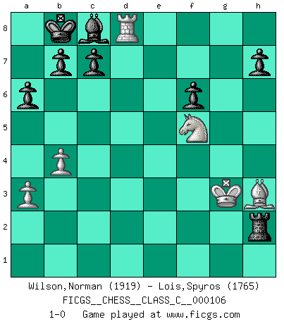 Last move : 1-0 2009 March 7 11:57:22 [Event "FICGS__CHESS__CLASS_C__000106"] [Site "FICGS"] [Date "2009.01.31"] [Round "1"] [White "Wilson,Norman"] [Black "Lois,Spyros"] [Result "1-0"] [WhiteElo "1919"] [BlackElo "1765"] 1.d4 d5 2.e3 Nc6 3.Nc3 f6 4.Nf3 e5 5.Be2 Be6 6.a3 Qd7 7.Bd2 O-O-O 8.dxe5 fxe5 9.h3 Nf6 10.O-O Bd6 11.Nb5 Be7 12.Bc3 Ne4 13.Bxe5 a6 14.Nbd4 Kb8 15.Nxc6+ Qxc6 16.Nd4 Qb6 17.c4 Bf6 18.Bxf6 gxf6 19.Qc2 Rhg8 20.c5 Nxc5 21.Rfc1 Bxh3 22.Qxc5 Rxg2+ 23.Kh1 Qxc5 24.Rxc5 Rdg8 25.Bf3 Rxf2 26.Bxd5 Rg5 27.b4 Re5 28.Rg1 Rxe3 29.Rg8+ Bc8 30.Bg2 Rf4 31.Nf5 Re2 32.Bh3 Re1+ 33.Kg2 Rfe4 34.Rd5 R1e2+ 35.Kf3 Re8 36.Rd8 Rxd8 37.Rxd8 Rh2 38.Kg3 1-0 Queen's pawn game Queenside Castling by player Black (move 7) Kingside Castling by player White (move 10) Player White won this chess game. Follow this game move after move (download)Fischer, who may or may not be mad as a hatter, has every right to be horrified. (Jeremy Silman) Darum geht es im Schach. Einen Tag gibst du deinem Gegner eine Lektion, am nächsten Tag gibt er dir eine. (Robert James Fischer) Un Peón pasado es un criminal, quién debe ser mantenido bajo candado y llave. Leves medidas, tales como vigilancia policiaca, no son suficientes. (Aaron Nimzovich) A chaque perte on perd un peu de soi. (Joël Lautier) Hello Thibault, if I have had a plan (and I had one, I hope), I have forgotten it during the last week... - Hello Heinz-Georg. What do you mean a plan ? (Anonymous players, during a Big Chess game)