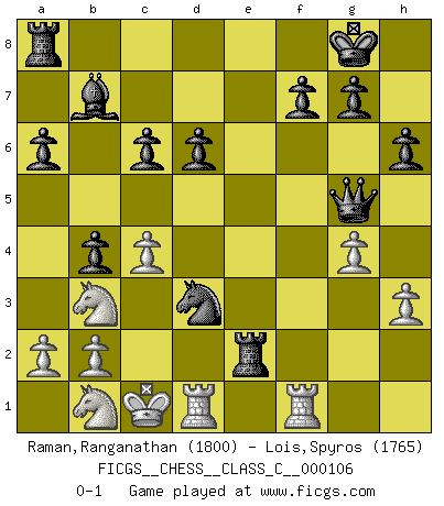 Last move : 0-1 2009 April 16 2:52:26 [Event "FICGS__CHESS__CLASS_C__000106"] [Site "FICGS"] [Date "2009.01.31"] [Round "1"] [White "Raman,Ranganathan"] [Black "Lois,Spyros"] [Result "0-1"] [WhiteElo "1800"] [BlackElo "1765"] 1.e4 e5 2.Bc4 Nf6 3.Nc3 c6 4.Qe2 Bc5 5.Nf3 d6 6.h3 O-O 7.d3 h6 8.Be3 Nbd7 9.O-O-O a6 10.d4 exd4 11.Bxd4 b5 12.Bb3 Re8 13.Qd3 Bb7 14.g4 Bxd4 15.Nxd4 Nc5 16.Qe3 Nxb3+ 17.Nxb3 b4 18.Nb1 Nxe4 19.Rhf1 Nc3 20.Qd3 Ne2+ 21.Kd2 Qg5+ 22.f4 Nxf4 23.Qf3 Ng6 24.Qf4 Nxf4 25.c4 Re2+ 26.Kc1 Nd3+ 0-1 Bishop's Opening : Berlin defense Kingside Castling by player Black (move 6) Queenside Castling by player White (move 9) Player Black won this chess game. Follow this game move after move (download)The tactician must know what to do whenever something needs doing; the strategist must know what to do when nothing needs doing. (Savielly Tartakover) Was ist der Unterschied zwischen einem Strassenarbeiter und einem Schachspieler? --Der Schachspieler bewegt sich ab und zu. (Anonymous) El Ajedrez por encima de todo... ¡es una pelea!. (Emanuel Lasker) Soyez une menace à chaque fois que vous vous asseyez pour jouer. (Ken Smith) Life is like a play: it's not the length but the excellence of the acting that matters. (Seneca)