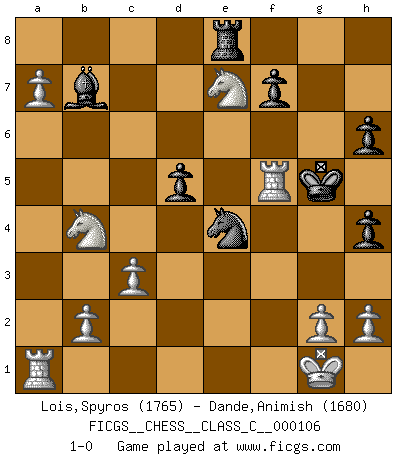 Last move : 1-0 2009 April 16 14:53:19 [Event "FICGS__CHESS__CLASS_C__000106"] [Site "FICGS"] [Date "2009.01.31"] [Round "1"] [White "Lois,Spyros"] [Black "Dande,Animish"] [Result "1-0"] [WhiteElo "1765"] [BlackElo "1680"] 1.e4 c5 2.Nf3 d6 3.d4 cxd4 4.Nxd4 Nf6 5.Nc3 a6 6.Bg5 e6 7.f4 Nbd7 8.Qf3 h6 9.Bh4 b5 10.e5 g5 11.exf6 gxh4 12.Qxa8 d5 13.Bxb5 axb5 14.Nc6 Qc7 15.Nxb5 Bb4+ 16.c3 Qb7 17.Qxb7 Bxb7 18.Nxb4 Kf8 19.a4 Nxf6 20.a5 Kg7 21.a6 Bc8 22.Nd4 Ne4 23.f5 exf5 24.a7 Bb7 25.Nxf5+ Kf6 26.O-O Kg5 27.Ne7 Re8 28.Rf5+ 1-0 Sicilian : Najdorf, 7.f4 Kingside Castling by player White (move 26) Player White won this chess game. Follow this game move after move (download)Fischer was a master of clarity and a king of artful positioning. His opponents would see where he was going but were powerless to stop him. (Bruce Pandolfini) Wir irren allesamt, nur jeder irrt anders. (Georg Christoph Lichtenberg) El Ajedrez es en su esencia, un juego. En su forma, un arte. Y en su ejecución, una ciencia. (Baron Tassilo) Le succès, c'est être capable d'aller d'échec en échec sans perdre son enthousiasme. (Winston Churchill) You think that education is too expensive ? Try ignorance. (Derek Bok)