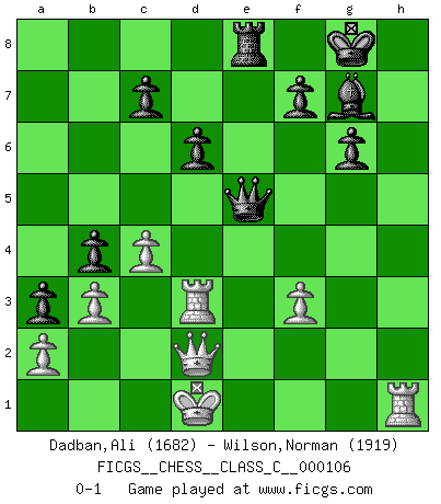 Last move : 0-1 2009 March 10 11:40:45 [Event "FICGS__CHESS__CLASS_C__000106"] [Site "FICGS"] [Date "2009.01.31"] [Round "1"] [White "Dadban,Ali"] [Black "Wilson,Norman"] [Result "0-1"] [WhiteElo "1682"] [BlackElo "1919"] 1.e4 e5 2.Nf3 d6 3.d4 exd4 4.Nxd4 Nf6 5.Nc3 Bd7 6.Bc4 Nc6 7.Bg5 Be7 8.Nb3 h6 9.Bf4 a6 10.Qe2 b5 11.Bd3 O-O 12.O-O-O Ne5 13.Nd5 Nxd5 14.exd5 Bf6 15.f3 Re8 16.Qf2 Nxd3+ 17.Rxd3 b4 18.h4 a5 19.g4 a4 20.Nd4 a3 21.b3 Ra5 22.Nc6 Bxc6 23.dxc6 Qa8 24.g5 Bb2+ 25.Kd1 hxg5 26.hxg5 Qxc6 27.Qh4 g6 28.c4 Rf5 29.Rh3 Qc5 30.Rh1 Bg7 31.Qh2 Rxg5 32.Bxg5 Qxg5 33.Qd2 Qe5 0-1 Philidor : Exchange variation Kingside Castling by player Black (move 11) Queenside Castling by player White (move 12) Player Black won this chess game. Follow this game move after move (download)We like to think. (Gary Kasparov) Ich tröste mich mit dem Vergnügen, daß Schachfans, Zuschauer und Leser glücklich sind, wenn ein Großmeister etwas riskiert, statt nur Klötzchen zu schieben. (Mikhail Nekhemyevich Tal) Un jugador que trata de regresar una movida en el Ajedrez es un futuro carterista. (Richard Fenton) C'est une question de caractère, Beaucoup de gens perdent leur motivation très vite. D'autres, ils sont rares, peuvent la conserver très longtemps. J'aime les échecs, encore aujourd'hui je suis heureux d'analyser des parties. J'aime toujours gagner, je déteste encore perdre. Bien jouer est important pour mon intégrité intellectuelle et morale. Et puis les échecs vivent en ce moment une période historique grâce à Internet. Ils se développent dans les systèmes éducatifs à travers le monde. Ils sortent de leur ghetto, et c'est mon rôle de mener à bien cette révolution. (Gary Kasparov) There's no money in correspondence chess. (John Knudsen)