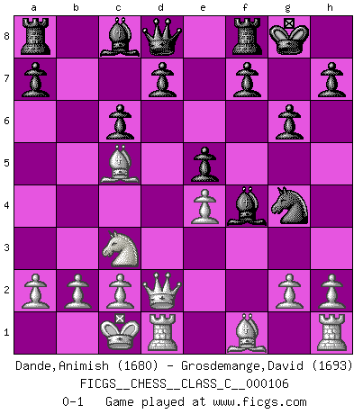 Last move : 0-1 2009 February 2 16:40:39 [Event "FICGS__CHESS__CLASS_C__000106"] [Site "FICGS"] [Date "2009.01.31"] [Round "1"] [White "Dande,Animish"] [Black "Grosdemange,David"] [Result "0-1"] [WhiteElo "1680"] [BlackElo "1693"] 1.e4 c5 2.Nf3 Nc6 3.d4 cxd4 4.Nxd4 g6 5.Be3 Bg7 6.Qd2 Nf6 7.Nc3 O-O 8.O-O-O Ng4 9.Nxc6 bxc6 10.Bd4 Bh6 11.f4 e5 12.Bc5 Bxf4 0-1 Sicilian defense Kingside Castling by player Black (move 7) Queenside Castling by player White (move 8) Player Black won this chess game. Follow this game move after move (download)Some part of a mistake is always correct. (Savielly Tartakover) Die Fehler sind da, Sie warten nur darauf gemacht zu werden. (Savielly Grigorievitsch Tartakower) El Ajedrez es parte de la cultura, y si una cultura esta en decadencia, entonces también el Ajedrez declinará. (Mikhail Botvinnik) Les Echecs sont affaire de jugement sensible. Savoir quand frapper et quand esquiver. (Fischer) All the biggest technological inventions created by man - the airplane, the automobile, the computer - says little about his intelligence, but speaks volumes about his laziness. (Mark Kennedy)