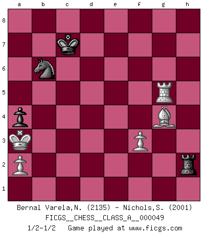 Last move : 1/2-1/2 2009 May 23 18:52:35 [Event "FICGS__CHESS__CLASS_A__000049"] [Site "FICGS"] [Date "2009.02.01"] [Round "1"] [White "Bernal Varela,Nelson"] [Black "Nichols,Scott"] [Result "1/2-1/2"] [WhiteElo "2135"] [BlackElo "2001"] 1.e4 c5 2.Nf3 d6 3.d4 cxd4 4.Nxd4 Nf6 5.Nc3 g6 6.Be3 Bg7 7.f3 O-O 8.Qd2 Nc6 9.O-O-O Nxd4 10.Bxd4 Be6 11.Kb1 Rc8 12.g4 Nd7 13.Bxg7 Kxg7 14.Nd5 Bxd5 15.exd5 Rc5 16.h4 Nf6 17.c4 b5 18.h5 bxc4 19.hxg6 fxg6 20.Qh6+ Kf7 21.g5 c3 22.Rh2 Nxd5 23.Qxh7+ Ke8 24.Qxg6+ Kd7 25.Bh3+ Kc7 26.Qe4 Rf4 27.Qe6 Nb6 28.g6 Rf6 29.Qg4 Qg8 30.Rg1 cxb2 31.Rxb2 Rc4 32.Qg5 Rc5 33.Qe3 Rxg6 34.Qxe7+ Kb8 35.Qxd6+ Rxd6 36.Rxg8+ Kc7 37.Ka1 Rh6 38.Bg4 Rc1+ 39.Rb1 Rxb1+ 40.Kxb1 a5 41.Rg5 Rh1+ 42.Kb2 Rh2+ 43.Kb3 a4+ 44.Ka3 1/2-1/2 Sicilian : Dragon, Yugoslav attack, 7...O-O Kingside Castling by player Black (move 7) Queenside Castling by player White (move 9) 10 pieces endgame at move 39 : White KRBPP , Black KRRNP WHITE : King + 1 Rook 1 Bishop 2 Pawns BLACK : King + 2 Rooks 1 Knight 1 Pawn 9 pieces endgame at move 40 : White KRBPP , Black KRNP WHITE : King + 1 Rook 1 Bishop 2 Pawns BLACK : King + 1 Rook 1 Knight 1 Pawn This chess game ended in a draw. Follow this game move after move (download)There is no remorse like the remorse of Chess. (H. G. Wells) Der Verteidiger gebe der Gewalt nach, aber nur der Gewalt. Er schaffe sich nicht freiwillig, etwa aus Blindheit oder aus Schrecken, irgendwelche Schwächen. Er lasse sich nicht bluffen. (Emanuel Lasker) Hasta este punto, las blancas han seguido un análisis bien conocido. Pero ahora el hace un error fatal: empieza a usar su propia cabeza. (Siegbert Tarrasch) Il n'y a pas de prix trop élevé au scalp de l'ennemi. (Koblentz) I teach you to lie, cheat and steal, and as soon as my back's turned you wait in line ? (Gregory House, House M.D.)