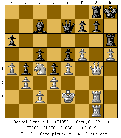 Last move : 1/2-1/2 2009 September 28 22:8:43 [Event "FICGS__CHESS__CLASS_A__000049"] [Site "FICGS"] [Date "2009.02.01"] [Round "1"] [White "Bernal Varela,Nelson"] [Black "Gray,Garvin"] [Result "1/2-1/2"] [WhiteElo "2135"] [BlackElo "2111"] 1.e4 e5 2.Nf3 Nc6 3.Bb5 a6 4.Bxc6 dxc6 5.O-O Qd6 6.Na3 Be6 7.Qe2 Bg4 8.h3 Bxf3 9.Qxf3 b5 10.d3 Nf6 11.Nb1 Be7 12.a3 Nd7 13.Be3 Nc5 14.Qg3 O-O 15.Nd2 Ne6 16.a4 c5 17.Rfc1 Nd4 18.Qg4 Rfd8 19.Ra2 Bf6 20.h4 Be7 21.b3 Qc6 22.Rb1 Rd6 23.Re1 b4 24.Qg3 Re6 25.Nc4 Bd6 26.Qg4 h6 27.h5 Rf8 28.Rb2 Qd7 29.Bxd4 cxd4 30.Re2 Qc6 31.Rb1 Qd7 32.R2e1 Qc6 33.Rf1 Rd8 34.g3 Qd7 35.Rbe1 c6 36.Kh1 Bc7 37.Qh3 Qe7 38.f4 Re8 39.Re2 Qd7 40.Rh2 Qc8 41.Rg2 Rf8 42.Rgf2 Qe8 43.f5 Rf6 44.g4 Kh7 45.Rg2 Rh8 46.Qg3 Qd8 47.Kg1 c5 48.g5 hxg5 49.Qxg5 Rg8 50.Kf2 Rh6 51.Qg4 Qf6 52.Rfg1 Kh8 53.Ke2 Qe7 1/2-1/2 Ruy Lopez : Exchange, Bronstein variation Kingside Castling by player White (move 5) Kingside Castling by player Black (move 14) This chess game ended in a draw. Follow this game move after move (download)Of Chess it has been said that life is not long enough for it, but that is the fault of life, not Chess. (William Ewart Napier) Konzentriere dich auf materielle Gewinne. Nimm, was dir dein Gegner gibt, ausser es gibt einen guten Grund der dagegenspricht. (Robert James Fischer) Combinaciones deslumbrantes son para la mayoría, mover madera es para los pocos. (Georg Kieninger) Toutes choses étant égales, c'est la conviction qui gagne. Alliée à une volonté de vaincre, elle sert de détonateur, suscite des idées, disperse les doutes et aide à penser clairement. (Robert Fischer) This is where the fun begins. (Anakin Skywalker in Star Wars ep.3)