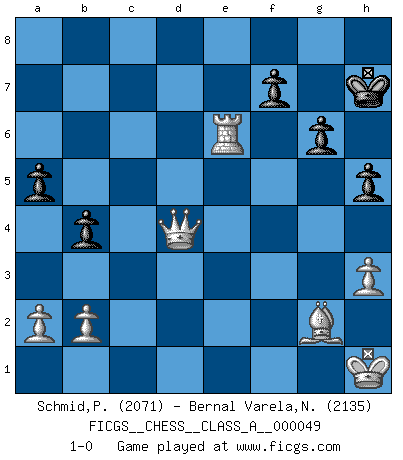 Last move : 1-0 2009 November 27 0:56:45 [Event "FICGS__CHESS__CLASS_A__000049"] [Site "FICGS"] [Date "2009.02.01"] [Round "1"] [White "Schmid,Pablo"] [Black "Bernal Varela,Nelson"] [Result "1-0"] [WhiteElo "2071"] [BlackElo "2135"] 1.d4 Nf6 2.f3 d5 3.e4 dxe4 4.Nc3 exf3 5.Nxf3 g6 6.Bc4 Bg7 7.O-O O-O 8.Qe1 Nc6 9.Qh4 Bf5 10.h3 Bxc2 11.Rf2 Bf5 12.Bh6 Nb4 13.Rd1 b5 14.Bb3 c6 15.Ng5 e6 16.g4 Nd3 17.gxf5 Nxf2 18.fxe6 Nd5 19.Nxd5 cxd5 20.e7 Qxe7 21.Kxf2 Qf6+ 22.Kg2 Bxh6 23.Qxh6 Qg7 24.Qh4 h6 25.Nf3 Rad8 26.Rc1 Rfe8 27.Ne5 Rd6 28.Qg3 Rde6 29.Kh1 Rxe5 30.dxe5 Rxe5 31.Rd1 Qf6 32.Bxd5 a5 33.Qd3 b4 34.Qd2 Kh7 35.Bg2 Qe6 36.Qd4 Re1+ 37.Rxe1 h5 38.Rxe6 1-0 Blackmar-Diemer gambit Kingside Castling by player White (move 7) Kingside Castling by player Black (move 7) Player White won this chess game. Follow this game move after move (download)There's never before been a Chess player with such a thorough knowledge of the intricacies of the game and such an absolutely indomitable will to win. I think Bobby is the greatest player that ever lived. (Lisa Lane) Das ganze Leben mit einer Ehefrau ist wie ein Endspiel mit ungleichfarbigen Läufern. (Viktor Kortschnoi) La belleza de un movimiento no se refleja solo en su apariencia, sino en el pensamiento detrás de él. (Siegbert Tarrasch) Il (Jacob Murray) ne joue pas pour le bon coup, mais pour le meilleur. (Eloi Relange) No, I am still playing. (Anatoly Karpov)