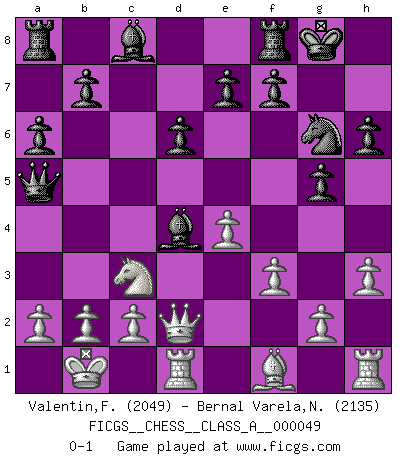 Last move : 0-1 2009 May 22 15:34:5 [Event "FICGS__CHESS__CLASS_A__000049"] [Site "FICGS"] [Date "2009.02.01"] [Round "1"] [White "Valentin,Florea"] [Black "Bernal Varela,Nelson"] [Result "0-1"] [WhiteElo "2049"] [BlackElo "2135"] 1.e4 c5 2.Nf3 d6 3.d4 cxd4 4.Nxd4 Nf6 5.Nc3 a6 6.Be3 Ng4 7.Bg5 h6 8.Bh4 g5 9.Bg3 Bg7 10.h3 Ne5 11.f3 Nbc6 12.Bf2 Ng6 13.Qd2 O-O 14.O-O-O Qa5 15.Kb1 Nxd4 16.Bxd4 Bxd4 0-1 Sicilian : Najdorf, Byrne (English) attack Kingside Castling by player Black (move 13) Queenside Castling by player White (move 14) Player Black won this chess game. Follow this game move after move (download)Chess is in its essence a game, in its form an art, and in its execution a science. (Baron Tassilo) Zum Sieg gelangt man nicht, wenn man gut, sondern nur wenn man besser spielt (Savielly Grigorievitsch Tartakower) El Ajedrez, como cualquier otra actividad creativa, puede existir solo a través de méritos combinados de aquellos que tienen talento creativo y de aquellos que tienen la habilidad de organizar un trabajo creativo. (Mikhail Botvinnik) La vérité est comme le meilleur coup aux échecs : elle existe, mais il faut la chercher. (Arturo Perez-Reverte) Opportunities multiply as they are seized. (Sun Tzu)
