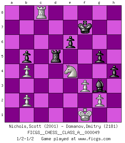 Last move : 1/2-1/2 2009 April 19 0:35:49 [Event "FICGS__CHESS__CLASS_A__000049"] [Site "FICGS"] [Date "2009.02.01"] [Round "1"] [White "Nichols,Scott"] [Black "Domanov,Dmitry"] [Result "1/2-1/2"] [WhiteElo "2001"] [BlackElo "2181"] 1.e4 c5 2.d4 cxd4 3.c3 dxc3 4.Nxc3 e6 5.Nf3 Nc6 6.Bc4 a6 7.O-O Nge7 8.h4 b5 9.Bb3 Bb7 10.h5 Na5 11.Qe2 Nxb3 12.axb3 Nc6 13.Rd1 Rc8 14.Bf4 Be7 15.Rd3 Nb4 16.Rd2 O-O 17.h6 g6 18.Bd6 Nd5 19.exd5 Bxd6 20.dxe6 Bxf3 21.Qxf3 fxe6 22.Qd3 Rc6 23.Ne4 Rf5 24.Rad1 Bf8 25.Qxd7 Qxd7 26.Rxd7 Bxh6 27.R7d6 Rxd6 28.Rxd6 Re5 29.f3 Bc1 30.Rxa6 g5 31.Kf1 Kf7 32.Nf2 Bf4 33.b4 h5 34.Ra7+ Kg6 35.Re7 Bg3 36.Ne4 h4 37.Re8 Kf7 38.Rc8 Rd5 1/2-1/2 Sicilian : Smith-Morra gambit Kingside Castling by player White (move 7) Kingside Castling by player Black (move 16) This chess game ended in a draw. Follow this game move after move (download)If your opponent offers you a draw, try to work out why he thinks he's worse off. (Nigel Short) Ich habe die Schachforschung dermaßen betrieben, dass sie auf eine wissenschaftliche Basis gestellt wurde. (Mikhail Moiseyevich Botvinik) No hay precio que sea tan grande por la cabellera del Rey enemigo. (Koblentz) Nous sommes les pions de la mystérieuse partie d'Echecs jouée par Dieu. Il nous déplace, nous arrête, nous pousse encore, puis nous lance un à un dans la boîte du Néant. Epitaphe sur la tombe de David Janowsky (1868-1927). Hardware: the parts of a computer that can be kicked. (Jeff Persis)