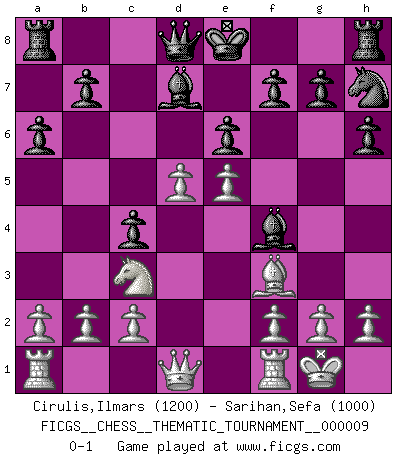 Last move : 0-1 2006 September 6 9:19:11 [Event "FICGS__CHESS__THEMATIC_TOURNAMENT__000009"] [Site "FICGS"] [Date "2006.08.27"] [Round "1"] [White "Cirulis,Ilmars"] [Black "Sarihan,Sefa"] [Result "0-1"] [WhiteElo "1200"] [BlackElo "1000"] 1.d4 Nf6 2.Bg5 e6 3.Nf3 Be7 4.Nc3 d5 5.e3 a6 6.Bd3 h6 7.Bf4 Bd7 8.Ne5 c5 9.O-O c4 10.Be2 Nc6 11.Bf3 Nxe5 12.dxe5 Nh7 13.e4 Bg5 14.exd5 Bxf4 0-1 Trompowsky attack (Ruth, Opovcensky Opening) Kingside Castling by player White (move 9) Player Black won this chess game. Follow this game move after move (download)It's always better to sacrifice your opponent's men. (Savielly Tartakover) Versuche, dich von der Sklaverei der Eröffnungsvarianten zu befreien. Stattdessen soll man gewisse Typenpositionen erlernen, die man eingehend analysiert. (Aaron Nimzowitsch) El Ajedrez se juega con la mente... ¡no con las manos!. (Renaud y Kahn) Des combinaisons [dans le jeu d'échecs] pareilles à des mélodies. Je crois entendre pour ainsi dire la musique des coups... (Vladimir Nabokov) Gambling : The sure way of getting nothing from something. (Wilson Mizner)
