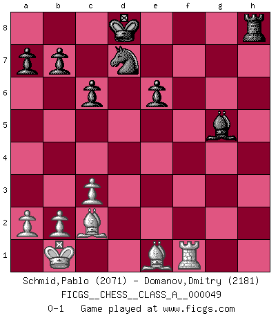 Last move : 0-1 2009 September 8 10:21:49 [Event "FICGS__CHESS__CLASS_A__000049"] [Site "FICGS"] [Date "2009.02.01"] [Round "1"] [White "Schmid,Pablo"] [Black "Domanov,Dmitry"] [Result "0-1"] [WhiteElo "2071"] [BlackElo "2181"] 1.d4 Nf6 2.f3 d5 3.e4 dxe4 4.Nc3 exf3 5.Nxf3 Bf5 6.Ne5 e6 7.g4 Be4 8.Nxe4 Nxe4 9.Qf3 Qxd4 10.Qxf7+ Kd8 11.Qf4 Bb4+ 12.c3 g5 13.Qe3 Qxe5 14.Bg2 Be7 15.Bxe4 Nd7 16.Bd2 c6 17.O-O-O Kc7 18.Rhe1 Bd6 19.Kb1 h5 20.gxh5 Rxh5 21.h3 Rh4 22.Bc2 Qxe3 23.Rxe3 Nf8 24.Rf3 Bf4 25.Be1 Rh8 26.h4 Rd8 27.Rxd8 Kxd8 28.hxg5 Bxg5 29.Rf1 Nd7 0-1 This chess game has been lost on time (started : 2009.02.01 13:10:7) Blackmar-Diemer gambit Queenside Castling by player White (move 17) Player Black won this chess game. Follow this game move after move (download)A bad day of Chess is better than any good day at work. (Anonymous) Wenn ein Kopf und ein Buch zusammenstoßen und es klingt hohl, ist es denn allemal im Buche? (Georg Christoph Lichtenberg) El sobresalir en el Ajedrez es un signo de una mente intrigante. (Sir Arthur Conan Doyle) Les échecs sont utiles à l'exercice de la faculté de penser et à celle de l'imagination. Car nous devons posséder une méthode élaborée pour atteindre des buts partout où nous devons conduire notre raison. (Leibnitz) It is not true that people stop pursuing dreams because they grow old, they grow old because they stop pursuing dreams. (Gabriel Garcia Marquez)
