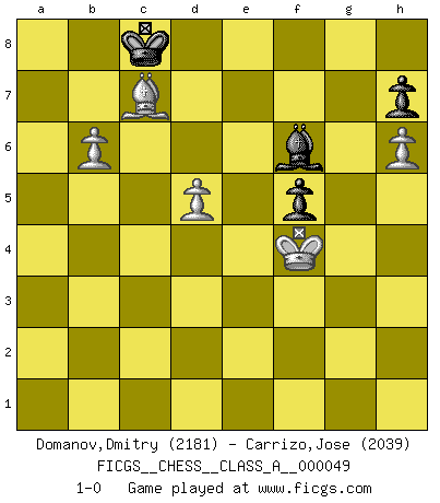 Last move : 1-0 2009 August 15 21:32:50 [Event "FICGS__CHESS__CLASS_A__000049"] [Site "FICGS"] [Date "2009.02.01"] [Round "1"] [White "Domanov,Dmitry"] [Black "Carrizo,Jose"] [Result "1-0"] [WhiteElo "2181"] [BlackElo "2039"] 1.e4 e5 2.Nf3 Nc6 3.Bb5 a6 4.Ba4 Nf6 5.O-O Be7 6.Re1 b5 7.Bb3 d6 8.c3 O-O 9.d4 Bg4 10.Be3 Bh5 11.h3 exd4 12.cxd4 d5 13.e5 Ne4 14.Nc3 Nxc3 15.bxc3 Na5 16.Bc2 Nc4 17.g4 Bg6 18.Bf5 a5 19.Nd2 Na3 20.Rc1 Ra6 21.Kh2 Rc6 22.Qf3 b4 23.cxb4 Rxc1 24.Rxc1 axb4 25.h4 Nb5 26.h5 Kh8 27.Qg2 Bxf5 28.gxf5 Rg8 29.Nf3 Qc8 30.Qg4 Nc3 31.h6 g6 32.Ng5 Rf8 33.a3 Ne4 34.Nxe4 dxe4 35.d5 Qd7 36.Qxe4 gxf5 37.Qd4 f6 38.axb4 fxe5 39.Qxe5+ Bf6 40.Qe6 Qe8 41.Qxe8 Rxe8 42.Bf4 Kg8 43.Bxc7 Re2 44.Rg1+ Kf7 45.b5 Rxf2+ 46.Rg2 Rxg2+ 47.Kxg2 Ke8 48.Kf3 Kd7 49.b6 Kc8 50.Kf4 1-0 Ruy Lopez : Closed Kingside Castling by player White (move 5) Kingside Castling by player Black (move 8) 10 pieces endgame at move 46 : White KBPPP , Black KRBPP WHITE : King + 1 Bishop 3 Pawns BLACK : King + 1 Rook 1 Bishop 2 Pawns 9 pieces endgame at move 47 : White KBPPP , Black KBPP WHITE : King + 1 Bishop 3 Pawns BLACK : King + 1 Bishop 2 Pawns Player White won this chess game. Follow this game move after move (download)Nothing excites jaded Grandmasters more than a theoretical novelty. (Dominic Lawson) Der Vorposten provoziert a) eine Basis für neue Angriffe und b) eine Schwächung der gegnerischen Widerstandskraft in der fraglichen Linie. (Aaron Nimzowitsch) Cuando estes solo, cuando te sientas un extraño en el mundo, juega al Ajedrez. Esto levantará tu espiritu y será tu consejero de guerra. (Aristóteles) Une platitude souvent récitée à propos des Echecs est qu'une des choses les plus difficiles à réaliser est de gagner une position gagnante. Cela ne manque pas de sens mais, pour ma part, j'ai toujours trouvé plus difficile de gagner une position perdante. (Tim Krabbe) Fear is the path to the dark side. Fear leads to anger; anger leads to hate; hate leads to suffering. I sense much fear in you. (Master Yoda in Star Wars ep.1)