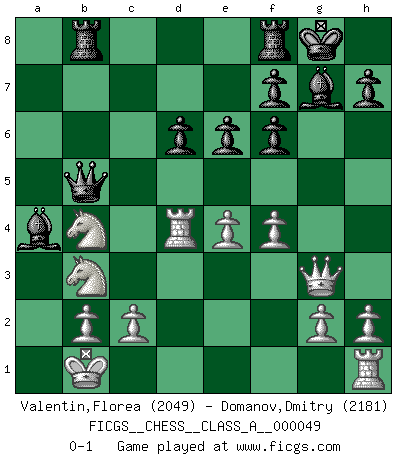 Last move : 0-1 2009 May 22 15:34:33 [Event "FICGS__CHESS__CLASS_A__000049"] [Site "FICGS"] [Date "2009.02.01"] [Round "1"] [White "Valentin,Florea"] [Black "Domanov,Dmitry"] [Result "0-1"] [WhiteElo "2049"] [BlackElo "2181"] 1.e4 c5 2.Nf3 d6 3.d4 cxd4 4.Nxd4 Nf6 5.Nc3 a6 6.Be3 e6 7.Be2 Qc7 8.Qd2 b5 9.f3 Nbd7 10.a3 Ne5 11.O-O-O Bd7 12.Bg5 Rb8 13.Bxf6 gxf6 14.f4 Nc4 15.Qe1 a5 16.Bxc4 Qxc4 17.Nb3 Qc7 18.Na2 b4 19.axb4 axb4 20.Kb1 Ba4 21.Rd3 Bg7 22.Nxb4 Qc4 23.Rd4 Qb5 24.Qg3 O-O 0-1 Sicilian : Najdorf, Byrne (English) attack Queenside Castling by player White (move 11) Kingside Castling by player Black (move 24) Player Black won this chess game. Follow this game move after move (download)Many Chess players were surprised when after the game, Fischer quietly explained: 'I had already analyzed this possibility' in a position which I thought was not possible to foresee from the opening. (Mikhail Tal) Matt entspricht nicht immer den Tatsachen. (Savielly Grigorievitsch Tartakower) Cada Peón es potencialmente una Reina. (James Mason) Les pièces de l'échiquier étaient impitoyables. Elles le retenaient, elles l'absorbaient. Il y avait de l'horreur en cela, mais aussi une harmonie unique. Car, qu'y a-t-il dans le monde, à part les échecs ? (V. Nabokov) Only sick music makes money today. (Friedrich Nietzsche)