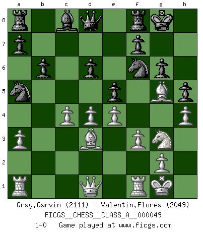 Last move : 1-0 2009 May 12 5:38:12 [Event "FICGS__CHESS__CLASS_A__000049"] [Site "FICGS"] [Date "2009.02.01"] [Round "1"] [White "Gray,Garvin"] [Black "Valentin,Florea"] [Result "1-0"] [WhiteElo "2111"] [BlackElo "2049"] 1.d4 Nf6 2.c4 e6 3.Nc3 Bb4 4.a3 Bxc3+ 5.bxc3 b6 6.f3 Nc6 7.e4 e5 8.Be3 d6 9.Ne2 Na5 10.Ng3 h5 11.h4 c5 12.Bd3 O-O 13.Bg5 g6 14.O-O cxd4 15.cxd4 1-0 This chess game has been lost on time (started : 2009.02.01 13:10:7) Nimzo-Indian : Saemisch variation Kingside Castling by player Black (move 12) Kingside Castling by player White (move 14) Player White won this chess game. Follow this game move after move (download)Kasparov : J'adoube , Ivanchuk : S'il vous plaît ! (Garry Kasparov & Vassily Ivanchuk, Linares 1997) Alle offensichtlichen Züge sehen nach dem Spiel in der Analyse verdächtig aus. (Viktor Kortschnoi) Vive, pierde y aprende al observar a tu oponente como ganar. (Amber Steenbock) Les échecs c'est le défi de l'alpiniste, toujours plus haut, prêt à tout pour monter à l'assaut du Roi ennemi. Les échecs, c'est de la musique en mouvement, un ballet majestueux pour les yeux. C'est de la poésie composée par les fantômes du passé qui au même titre que Rimbaud ou Verlaine méritent notre admiration. Les échecs, c'est de la peinture ou le moindre mouvement modifie le tableau pour en faire un Picasso ou un Van Gogh. Les échecs, c'est tout et rien, c'est la vie et la mort. Jjulie33 sur le forum de France-Echecs. Treat your password like your toothbrush. Don't let anybody else use it, and get a new one every six months. (Clifford Stoll)