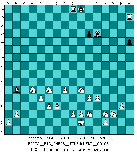Last move : 1-0 2009 July 3 21:42:7 [Event "FICGS__BIG_CHESS__TOURNAMENT__000034"] [Site "FICGS"] [Date "2009.02.01"] [Round "1"] [White "Carrizo,Jose"] [Black "Phillips,Tony"] [Result "1-0"] [WhiteElo "1739"] [BlackElo ""] 1.d2-d4 m15-m14 2.e2-e4 p15-p14 3.f1-c4 n15-n14 4.c1-p13 o15-o14 5.p13-k8 d15-d14 6.g2-g4 b16-d15 7.h1-f3 f15-f14 8.p2-p3 d15-c13 9.o1-p2 c15-c14 10.m2-m4 j15-k13 11.b1-c3 g15-g14 12.j2-g3 e15-e14 13.l1-o4 h16-l13 14.k1-l3 h14-h13 15.g1-j2 l13-k12 16.k8-d14 c13-d15 17.d14-f16 k12-f16 18.q2-q4 o16-p15 19.q4-q5 f14-f13 20.q5-q6 o14-o13 21.e4-e5 g16-h14 22.q6-q7 p16-o14 23.q7-q8 q15-q13 24.q8-q9 h15-k14 25.q9-q10 o14-n12 26.p1-o3 f16-c13 27.c4-b3 k16-h15 28.q10-q11 d15-f14 29.q11-q12 n12-o10 30.h3-h4 o10-n8 31.f3-f8 n8-o6 32.f8-m8 o6-p4 33.m1-o1 h14-g12 34.q1-q4 k14-j12 35.q4-p4 p15-k10 36.m8-k8 e14-e13 37.p4-p14 h15-k14 38.b3-n14 k14-m15 39.n14-o13 k13-m12 40.o13-k9 m15-n13 41.p14-p15 m12-n14 42.p15-p8 g12-h10 43.k9-j10 c13-d12 44.f2-f4 f13-f12 45.p2-q3 f14-g12 46.m4-m5 k10-h12 47.o4-n3 d12-d4 48.g3-f5 d4-b4 49.a1-b1 h12-g11 50.k8-g5 b4-b11 51.k2-k3 c16-f13 52.j1-k2 k15-k14 53.e1-d1 b11-b12 54.b2-b3 l16-m15 55.c3-d5 n14-o16 56.c2-c4 o16-p14 57.n3-k6 m15-k13 58.p8-p9 e13-e12 59.h2-j4 j12-l11 60.j10-l8 h10-j8 61.k6-j5 b12-b13 62.h4-h5 j8-k10 63.l8-j6 b13-e13 64.d1-d2 a15-a13 65.b1-d1 e16-d16 66.d5-f6 d16-d2 67.d1-d2 g12-f14 68.q3-f13 g14-f13 69.o1-d1 j16-j15 70.g5-g7 k10-j12 71.g7-c11 e13-c11 72.j5-c11 f14-d13 73.c11-g7 g11-a5 74.d2-d5 a5-f10 75.l3-m1 j14-j13 76.l2-l4 a13-a12 77.l4-l5 f10-j7 78.h5-h6 j7-n11 79.p9-b9 m16-b16 80.j2-l3 k13-g16 81.o3-n5 n11-q8 82.o2-o4 b15-b13 83.b9-c9 b16-c16 84.d5-c5 g16-h15 85.c9-c14 c16-d16 86.c5-d5 d13-b12 87.g7-b12 d16-d5 88.d1-d5 a16-b16 89.b12-d14 l11-k13 90.d14-f12 j15-h16 91.f12-b16 h16-j15 92.b16-f12 k13-h14 93.d5-d13 p14-q12 94.d13-b13 q12-o13 95.b13-b15 q13-q12 96.j6-l8 q16-d16 97.f5-d6 j15-j14 98.l8-n10 k14-k13 99.b15-b14 q8-j15 100.m1-n3 o13-m12 101.n10-o9 l15-l14 102.o9-m7 d16-f16 103.c14-f14 f16-p16 104.p3-p4 p16-o16 105.n5-o3 n13-m15 106.m7-f13 h15-g16 107.f13-e12 m15-k14 108.c4-c5 k13-k12 109.c5-c6 j14-k13 110.f14-f16 l14-l13 111.c6-c7 k13-j14 112.c7-c8 k14-h15 113.f16-a16 o16-o4 114.f12-o4 j12-g13 115.e12-g10 g16-f15 116.a16-a12 f15-e16 117.a12-a16 e16-d15 118.c8-c9 m12-k11 119.c9-c10 k11-h12 120.g10-h9 k12-k11 121.c10-c11 j13-j12 122.c11-c12 j12-j11 123.o4-p5 d15-e14 124.c12-c13 j14-j13 125.p5-j11 h12-k13 126.j11-l9 h14-j12 127.h9-k11 e14-d13 128.a16-a15 g13-e12 129.c13-c14 e12-d14 130.a15-h15 d14-c16 131.b14-b16 d13-e14 132.l9-k8 e14-f13 133.h15-f15 f13-e14 134.f15-c15 j12-g13 135.k8-f12 j15-h14 136.c15-c16 k13-h12 137.c16-j16 j13-k12 138.k11-h13 h12-f13 139.c14-c15 f13-e15 140.b16-e16 e15-d13 141.f12-g13 h14-g13 142.e16-e14 d13-c15 143.e14-m14 c15-e14 144.m14-e14 g13-a7 145.e14-k14 k12-l12 146.j16-j12 l12-m13 147.k14-q14 a7-f2 148.j4-k6 f2-e3 149.h13-k15 m13-n13 150.q14-q13 n13-m14 151.j12-j14 m14-l15 152.k15-m13 e3-b6 153.q13-q15 l15-k16 154.j14-j16 1-0 Follow this game move after move (download)Via the squares on the chessboard, the Indians explain the movement of time and the age, the higher influences which control the world and the ties which link Chess with the human soul. (Al-Masudi) Ich hatte Zahnschmerzen im ersten Spiel. In der zweiten Partie tat mir der Kopf weh. In der dritten war es eine Rheuma-Attacke und während der vierten fühlte ich mich nicht gut. Und in der fünften? Nun, man muss doch nicht jedes Spiel gewinnen, oder? (Savielly Grigorievitsch Tartakower) El Ajedrez es un cuento de Hadas de las 1001 metidas de pata. (Savielly Tartakower) Ce qui caractérise les parties de combat, c'est que si le défenseur a constamment de difficiles problèmes à résoudre, l'attaquant doit chercher sans relâche de nouvelles possibilités d'attaque. (Koblentz) When a man with money meets a man with experience, the man with experience leaves with money and the man with money leaves with experience. (Anonymous)