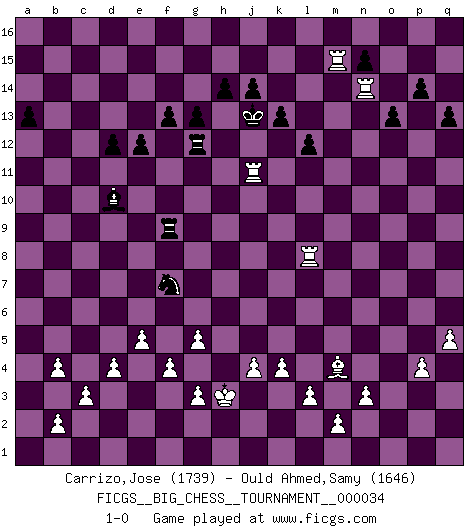 Last move : 1-0 2009 September 4 6:39:44 [Event "FICGS__BIG_CHESS__TOURNAMENT__000034"] [Site "FICGS"] [Date "2009.02.01"] [Round "1"] [White "Carrizo,Jose"] [Black "Ould Ahmed,Samy"] [Result "1-0"] [WhiteElo "1739"] [BlackElo "1646"] 1.d2-d4 g15-g13 2.e2-e4 h16-d12 3.c2-c3 d12-o2 4.p1-o3 o2-f10 5.g1-f3 m15-m13 6.j2-k4 p15-p14 7.h1-o7 l16-o13 8.o7-l7 k16-l14 9.l7-c15 b16-c14 10.c15-k8 o16-q14 11.k8-n5 m16-m14 12.c1-q14 p16-q14 13.q2-q4 m14-n14 14.n5-l7 f16-g15 15.f1-c4 q16-m16 16.n2-n3 g15-e13 17.l7-l4 j15-k13 18.k2-k3 n14-n10 19.j3-j4 n10-l10 20.l4-j6 d15-d13 21.l1-k2 o13-p12 22.j6-h7 g16-j15 23.k2-m4 f10-b10 24.c4-b3 p12-o13 25.h7-h6 q14-p12 26.b1-d2 e13-c11 27.h6-m6 l10-m10 28.m6-n7 m16-m14 29.l2-l3 m14-n14 30.n7-o7 j15-h13 31.o1-g8 n14-n10 32.g8-m13 m10-m13 33.b3-m13 h15-k14 34.m13-b3 c16-j10 35.q1-o1 j16-j15 36.o3-p5 e16-m16 37.o7-k7 j10-b3 38.a2-b3 e15-e14 39.a1-a4 m16-m10 40.a4-b4 b10-g10 41.k7-g10 m10-g10 42.b4-b15 c14-e13 43.h2-g4 k13-h12 44.k1-j3 k14-j12 45.j1-j2 k15-k13 46.e1-a1 a15-a13 47.o1-o11 d13-d12 48.b15-b13 e13-f11 49.j3-l4 l14-m12 50.o11-o8 j15-k14 51.e4-e5 a16-m16 52.g2-g3 m12-l10 53.f3-h4 h12-j10 54.f2-f4 j10-k8 55.b13-b15 f15-f13 56.d2-f3 k8-m7 57.o8-e8 e14-e13 58.f3-g5 l10-k8 59.g4-j3 p12-o10 60.j3-h5 o10-n8 61.h4-k5 j12-k10 62.h3-h4 o13-f5 63.j2-j3 f5-j8 64.b15-b14 k14-j13 65.p2-p3 k8-l6 66.k4-l6 j8-l6 67.l4-j5 l6-h9 68.m1-o1 o15-o13 69.h5-j7 h9-k11 70.o1-o11 m16-m11 71.o11-o1 h13-j11 72.j5-l6 k10-h9 73.j7-l8 h9-g7 74.e8-a8 g7-f5 75.l8-j9 g10-g12 76.j9-k11 m11-k11 77.j3-h3 j11-k9 78.b14-b15 l15-l13 79.b15-m15 n8-l9 80.l6-m8 k9-m8 81.a8-m8 f5-h6 82.k5-h6 c11-h6 83.k3-k4 m7-k8 84.m8-q8 q15-q13 85.q8-p8 n10-n14 86.o1-o6 h6-d10 87.a1-a11 e13-e12 88.p8-l8 l9-m7 89.o6-o5 l13-l12 90.p3-p4 k11-k9 91.q4-q5 k9-b9 92.b3-b4 b9-f9 93.p5-o7 f11-g9 94.o7-n5 m7-n5 95.o5-n5 k8-h7 96.n5-n14 h7-g5 97.h4-g5 g9-f7 98.a11-j11 1-0 Follow this game move after move (download)In order to improve your game, you must study the endgame before everything else, for whereas the endings can be studied and mastered by themselves, the middle game and the opening must be studied in relation to the endgame. (Jose Raul Capablanca) Sicherlich können nur Meister einen Stil haben. Daß ein nicht-Meister auch nur ein einziges Mal in seinem Leben eine Partie folgerecht durchführte, habe ich niemals bemerkt. (Emanuel Lasker) Los problemas de Ajedrez exigen del compositor las mismas virtudes que caracterizan todo el arte de valor: originalidad, invención, concisión, armonía, complejidad e insinceridad explendida. (Vladimir Nabokov) Mais l'homme est une créature légère et illogique : semblable au joueur d'échecs, il n'aime que le processus du but à atteindre, non le but lui-même. (Dostoïevsky) Man is reluctant to give credit for intelligence to anyone, except his enemies. (Albert Einstein)