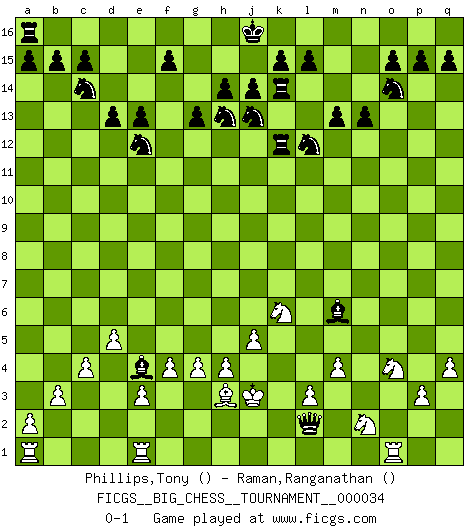 Last move : 0-1 2009 April 7 23:29:55 [Event "FICGS__BIG_CHESS__TOURNAMENT__000034"] [Site "FICGS"] [Date "2009.02.01"] [Round "1"] [White "Phillips,Tony"] [Black "Raman,Ranganathan"] [Result "0-1"] [WhiteElo ""] [BlackElo ""] 1.h2-j4 g15-g13 2.k1-l3 n15-n13 3.e2-e3 d15-d13 4.b2-b3 j15-h13 5.c1-b2 k16-l14 6.b2-j9 h16-a9 7.j2-g3 a9-j9 8.c2-c3 m15-m13 9.g1-e2 e15-e13 10.m2-m3 l16-q11 11.p1-o3 f16-b12 12.l3-k5 q11-k5 13.j4-l3 k5-c12 14.h1-k3 h15-k14 15.e2-f4 c16-g12 16.d2-d4 g12-d9 17.j3-j4 o16-e7 18.f4-d5 e7-d6 19.p2-p3 j9-j5 20.d5-f4 d9-f11 21.b1-d2 g16-f14 22.l3-j2 j5-o10 23.d2-e4 d6-k12 24.o1-p2 l14-j13 25.l1-n3 p16-o14 26.g3-h5 c12-h7 27.n3-k6 k12-n9 28.k6-n9 o10-n9 29.e4-g3 n9-n2 30.q1-o1 f11-o3 31.p2-o3 n2-o3 32.h5-k6 h7-k9 33.k6-l4 k9-q3 34.o1-n1 o3-o2 35.j2-l1 b12-n1 36.m3-m4 n1-a13 37.j4-j5 q3-p4 38.m1-m2 o2-n1 39.g3-j2 n1-n9 40.g2-g3 b16-c14 41.k3-l3 m16-m14 42.h3-h4 m14-l14 43.l4-n5 l14-l3 44.k2-l3 n9-q6 45.m2-o2 p4-n6 46.f1-h3 q16-m16 47.f4-h5 k14-l12 48.h5-k4 m16-m14 49.l1-m3 m14-k14 50.q2-q4 f14-e12 51.j2-l1 e16-e14 52.l1-n2 n6-k9 53.m3-o4 q6-c6 54.c3-c4 e14-f14 55.d4-d5 c6-f6 56.f2-f4 f6-c3 57.g3-g4 k9-e4 58.j1-k2 a13-g7 59.k2-j3 c3-d2 60.o2-o1 f14-f12 61.k4-h5 d2-k2 62.j3-j4 k2-l2 63.j4-j3 f12-k12 64.h5-k6 g7-m12 65.n5-l4 m12-p9 66.l4-m6 p9-m6 0-1 Follow this game move after move (download)The most powerful weapon in Chess is to have the next move. (David Bronstein) Ja, ich habe einmal eine Blitzpartie gespielt, es war in einem Zug, 1929. --im Interview 1989 (Mikhail Moiseyevich Botvinik) El tablero es el mundo, las piezas es el fenomeno del universo, las reglas del juego son lo que llamamos leyes de la naturaleza y el jugador del lado opuesto, se encuentra oculto a nuestra vista. (Thomas Huxley) Echiquier : carré parfait, comme la Jérusalem nouvelle décrite par l'auteur de l'Apocalypse, huit cases sur huit, exaltation du chiffre 4, symbole du cosmos aux quatre horizons... où le noir et le blanc, l'ombre et la lumière, le mal et le bien s'entremêlent et se conjuguent. (Robert Couffignal, Le Gambit du poète) If things go wrong, don't go with them. (Roger Babson)