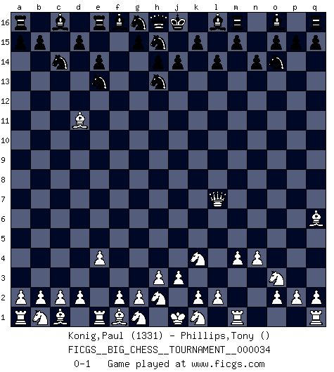 Last move : 0-1 2009 March 15 22:49:0 [Event "FICGS__BIG_CHESS__TOURNAMENT__000034"] [Site "FICGS"] [Date "2009.02.01"] [Round "1"] [White "Konig,Paul"] [Black "Phillips,Tony"] [Result "0-1"] [WhiteElo "1331"] [BlackElo ""] 1.j2-k4 n15-n14 2.h1-o7 p16-o14 3.o7-f15 e16-d16 4.f15-f12 j15-h13 5.f12-c15 d16-e16 6.p1-o3 b16-c14 7.c15-l7 l15-l14 8.n2-n4 e15-e14 9.m2-m4 h15-g13 10.o1-d11 k16-h15 11.l1-q6 g13-f15 12.e2-e4 f15-e13 0-1 Follow this game move after move (download)Chess is like war on a board. (Bobby Fischer) Das Schachspiel ist ein See, in welchem eine Mücke baden und ein Elefant ertrinken kann. (Emanuel Lasker) No hay otro maestro que tenga una voluntad terrífica de ganar. Al tablero, el irradía peligro y aún los oponentes mas fuertes tienden a congelarse como liebres cuando olfatean a una pantera. Aún sus debilidades son peligrosas. Con las blancas, su juego de apertura es predecible - te es posible hacer planes en su contra - pero es tan fuerte que tus planes casi nunca funcionan. En el juego medio, su precisión e invención son fabulosas y en finales, tú simplemente no le puedes vencer. (Experto Alemán anónimo) Le plus grand jeu de l'esprit jamais inventé, plus vous l'apprenez, plus vous y prenez du plaisir. (Garry Kasparov) You can only get smarter by playing a smarter opponent. (Revolver, movie)