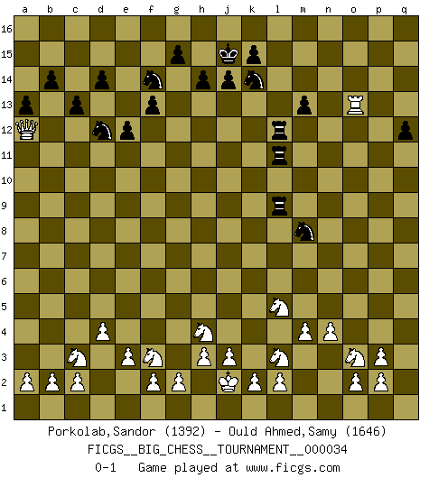 Last move : 0-1 2009 September 4 10:6:55 [Event "FICGS__BIG_CHESS__TOURNAMENT__000034"] [Site "FICGS"] [Date "2009.02.01"] [Round "1"] [White "Porkolab,Sandor"] [Black "Ould Ahmed,Samy"] [Result "0-1"] [WhiteElo "1392"] [BlackElo "1646"] 1.j2-h4 j15-k13 2.h1-o7 h15-g13 3.o7-o15 p16-o14 4.o15-c4 b16-c14 5.b1-c3 b15-b14 6.p1-o3 c16-a14 7.h2-k3 m15-m13 8.m2-m4 p15-p14 9.n2-n3 a14-o1 10.q1-o1 o16-q14 11.d2-d4 q14-c1 12.a1-c1 m16-m14 13.e2-e3 o14-n12 14.c4-c7 m14-l14 15.k1-l3 q16-o16 16.g1-f3 h16-p9 17.o1-p1 e15-e13 18.f1-b5 g16-j15 19.c7-d6 f16-d14 20.d6-n15 o16-o14 21.n15-d6 l16-p12 22.n3-n4 e16-e14 23.l1-p5 k16-h15 24.p5-q4 e13-e12 25.q4-p3 d14-p3 26.q2-p3 e14-d14 27.d6-q6 q15-q13 28.j1-j2 a16-e16 29.p1-q1 n12-o10 30.q6-a6 l14-l9 31.q1-q5 j15-h13 32.m1-q1 j16-j15 33.q5-p5 p9-m9 34.a6-n6 o14-n14 35.n6-j10 k13-l11 36.j10-o10 h15-k14 37.q1-q2 g13-f11 38.e1-q1 d14-d10 39.o10-o12 f11-g9 40.q2-q9 m9-q9 41.q1-q9 l9-q9 42.o12-l15 q9-l9 43.l15-o12 l11-n10 44.o12-o4 c14-e13 45.c1-q1 d15-d14 46.o4-o6 e16-l16 47.o6-q8 l9-l8 48.q8-o10 d10-l10 49.o10-j5 n14-n11 50.q1-q9 e13-f11 51.j5-c11 c15-c13 52.q9-g9 n11-l11 53.c11-a9 l16-a16 54.g9-d9 f11-d12 55.p5-o5 p12-o13 56.b5-d3 l10-l9 57.d3-o13 p14-o13 58.o5-o13 n10-p11 59.o13-p13 l9-d9 60.a9-d9 l8-l9 61.d9-f7 f15-f13 62.f7-p7 q13-q12 63.k3-l5 p11-o9 64.p7-p4 a16-l16 65.p13-o13 l16-l12 66.p4-n6 o9-m8 67.n6-a6 a15-a13 68.a6-a12 h13-f14 0-1 Follow this game move after move (download)A Chess game is divided into three stages: the first, when you hope you have the advantage, the second when you believe you have an advantage, and the third... when you know you're going to lose ! (Savielly Tartakower) In der Schule lernt man nichts. Es ist nur Zeitverschwendung. (Robert James Fischer) Un mal plan es mejor que no tener ningún plan. (Frank Marshall) Les échecs sont utiles à l'exercice de la faculté de penser et à celle de l'imagination. Car nous devons posséder une méthode élaborée pour atteindre des buts partout où nous devons conduire notre raison. (Leibnitz) Always be a first-rate version of yourself, instead of a second-rate version of somebody else. (Judy Garland)