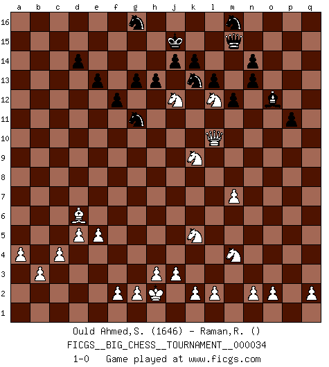 Last move : 1-0 2009 November 9 20:27:33 [Event "FICGS__BIG_CHESS__TOURNAMENT__000034"] [Site "FICGS"] [Date "2009.02.01"] [Round "1"] [White "Ould Ahmed,Samy"] [Black "Raman,Ranganathan"] [Result "1-0"] [WhiteElo "1646"] [BlackElo ""] 1.j2-k4 m15-m13 2.h1-o7 g15-g14 3.o7-c7 h15-j13 4.c7-c15 b16-c14 5.c15-o4 h16-f14 6.g1-f3 p16-q14 7.d2-d4 e15-e13 8.m2-m4 k16-l14 9.p2-p3 f16-c13 10.o1-q3 l16-n14 11.p1-o3 j15-k13 12.l1-n3 d15-d14 13.b2-b3 c16-q3 14.p3-p4 f14-f13 15.q1-p1 m13-m12 16.p1-p3 q3-p4 17.p3-p4 q14-o13 18.e2-e4 g16-j15 19.e4-e5 e16-h16 20.c1-a3 p15-p14 21.b1-d2 a16-g16 22.e1-e4 f13-a8 23.a3-d6 j15-h13 24.e4-f4 f15-f13 25.f4-f8 a8-c6 26.f1-c4 c6-g10 27.c4-n14 o15-n14 28.h2-g4 o16-q14 29.m4-m5 c13-n3 30.o4-n3 m16-m13 31.k1-l3 m13-n13 32.p4-n4 o13-n11 33.m5-m6 q16-o16 34.m1-m5 o16-o12 35.m5-g5 g10-m10 36.l3-k5 o12-n12 37.j1-j2 k13-l11 38.a1-m1 n11-l12 39.n4-n12 n13-n12 40.f8-n8 m10-p10 41.n8-n12 l11-n12 42.m1-m5 p10-q9 43.g5-g9 q9-o11 44.m5-n5 l12-m14 45.g9-b9 b15-b14 46.b9-c9 c14-d12 47.c9-c15 o11-o7 48.j2-h2 d12-b13 49.c15-c7 o7-l10 50.k5-l7 n14-n13 51.o3-m4 m14-o15 52.n5-n12 o15-m14 53.n12-n10 l10-m11 54.n3-n7 b13-d12 55.f3-g5 q14-g5 56.d2-f3 g5-o12 57.c7-c15 d12-b13 58.c15-c8 g14-g13 59.c2-c4 h13-g11 60.c8-q8 q15-q14 61.q8-p8 p14-p13 62.p8-m8 m11-c2 63.m8-b8 a15-a14 64.a2-a4 m14-o15 65.l7-j8 j13-g12 66.n10-c10 c2-g6 67.b8-c8 g12-f14 68.f3-h4 g6-d9 69.n7-c7 f13-f12 70.c10-c16 l14-j15 71.c16-g16 f14-g16 72.d4-d5 n15-n14 73.c7-c6 l15-l14 74.j8-h10 o12-q10 75.h4-k5 d9-h13 76.c8-c16 g16-e15 77.c16-h16 j16-h16 78.c6-a8 a14-a13 79.a8-b9 h13-e16 80.h10-g12 j15-g16 81.b9-g9 h16-j15 82.g9-b14 a13-a12 83.b14-f10 q10-o12 84.k4-j6 b13-d12 85.j6-h8 e16-h13 86.g12-j11 h13-j12 87.f10-f7 o15-m16 88.f7-a12 d12-f13 89.a12-h5 l14-l13 90.h5-q13 j12-m15 91.q13-q14 p13-p12 92.q14-p14 p12-p11 93.j11-l12 g11-j12 94.h8-k9 k15-k14 95.m6-m7 e15-g14 96.g4-h6 g14-h12 97.h6-j8 h12-k13 98.p14-l10 f13-g11 99.j8-h10 h14-h13 100.h10-j12 1-0 This big chess game has been lost on time (started : 2009.02.01 20:18:40) Follow this game move after move (download)You know, comrade Pachman, I don't enjoy being a Minister, I would rather play Chess like you. (Che Guevara) Ich habe die Schachforschung dermaßen betrieben, dass sie auf eine wissenschaftliche Basis gestellt wurde. (Mikhail Moiseyevich Botvinik) El hombre es un frívolo, una creatura engañosa y como un jugador de Ajedrez, se preocupa mas por el proceso de obtener su meta que de la meta por sí misma. (Dostoyevsky) Des idées, des idées, j'en ai cent, j'en ai mille. Des bonnes, des mauvaises, applicables, irréalisables... Il suffit de faire le tri ! (Roos) If you lose the game you should win the analysis! (Proverb)