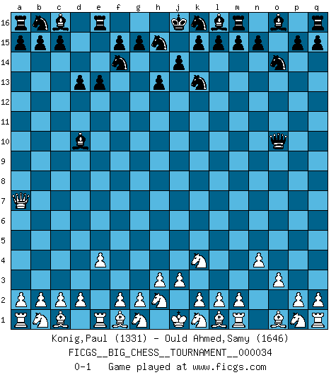 Last move : 0-1 2009 March 16 20:7:10 [Event "FICGS__BIG_CHESS__TOURNAMENT__000034"] [Site "FICGS"] [Date "2009.02.01"] [Round "1"] [White "Konig,Paul"] [Black "Ould Ahmed,Samy"] [Result "0-1"] [WhiteElo "1331"] [BlackElo "1646"] 1.j2-k4 j15-k13 2.h1-o7 h14-h13 3.o7-o15 p16-o14 4.o15-h9 h16-o10 5.h9-f7 g16-f14 6.o2-o3 d15-d13 7.f7-a7 e15-e13 8.n2-n4 f16-b12 9.e2-e4 b12-d10 0-1 Follow this game move after move (download)Chess is a cold bath for the mind. (Sir John Simon) Die Idee von Capablanca, Schach als Fach in den Schulen zu lehren, ist großartig. (Fidel Castro) El estómago es una parte esencial del maestro de Ajedrez. (Bent Larsen) Ce qui est bien, c'est d'avoir tout un tas de pièces en prise : l'adversaire ne peut en prendre qu'une à la fois. Cité par Thierry Audin. I know the human being and fish can coexist peacefully. (George W. Bush, Saginaw sept. 29, 2000)