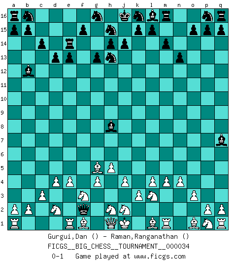 Last move : 0-1 2009 April 11 14:33:23 [Event "FICGS__BIG_CHESS__TOURNAMENT__000034"] [Site "FICGS"] [Date "2009.02.01"] [Round "1"] [White "Gurgui,Dan"] [Black "Raman,Ranganathan"] [Result "0-1"] [WhiteElo ""] [BlackElo ""] 1.g2-g4 d15-d13 2.d2-d4 n15-n13 3.j3-j4 g15-g13 4.h3-h4 j15-h13 5.e2-e4 h16-o10 6.o2-o3 e15-e13 7.m2-m3 f16-a11 8.g1-f3 c16-n6 9.k2-k3 o16-g9 10.l2-l4 g9-m4 11.k1-l3 c15-c14 12.c1-g5 a11-b12 13.n2-n3 m4-h8 14.m3-m4 m15-m14 15.c2-c3 n6-o5 16.n3-n4 o5-q7 17.h4-h5 o10-f2 18.b1-d2 e16-e14 0-1 This big chess game has been lost on time (started : 2009.02.01 20:18:40) Follow this game move after move (download)The sign of a great Master is his ability to win a won game quickly and painlessly. (Irving Chernev) Eine Person mit durchschnittlichem IQ kann etwa eine ELO von 2000 erreichen. (Jonathan Levitt) En un gambito tu regalas un Peón por el bién de tomar un juego perdido. (Samuel Standige Boden) Pour moi, les échecs ne sont pas un jeu mais un art. (Alexandre Alekhine) Wisdom doesn't necessarily come with age. Sometimes age just shows up all by itself. (Tom Wilson)
