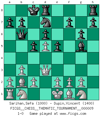 Last move : 1-0 2006 November 22 14:47:42 [Event "FICGS__CHESS__THEMATIC_TOURNAMENT__000009"] [Site "FICGS"] [Date "2006.08.27"] [Round "1"] [White "Sarihan,Sefa"] [Black "Dupin,Vincent"] [Result "1-0"] [WhiteElo "1000"] [BlackElo "1400"] 1.d4 Nf6 2.Bg5 c5 3.d5 Ne4 4.Bf4 Qb6 5.Be5 d6 6.Bc3 e5 7.Qd3 Bf5 8.Qf3 Bg6 9.b3 Be7 10.Bb2 Nd7 11.h4 O-O-O 12.h5 Ng5 13.Qe3 Bxh5 14.Rxh5 g6 15.Rxg5 Bxg5 16.Qd3 1-0 This chess game has been lost on time (started : 2006.08.27 0:26:25) Trompowsky attack (Ruth, Opovcensky Opening) Queenside Castling by player Black (move 11) Player White won this chess game. Follow this game move after move (download)I look one move ahead... the best ! (Siegbert Tarrasch) Ich möchte Schüler heranbilden, die das Vermögen haben, selbst zu denken und Kritik zu üben. (Emanuel Lasker) Por la belleza de sus partidas, la claridad de su juego y lo brillante de sus ideas, Fischer se creó el mismo como un artista de la misma estatura como Brahms, Rembrandt y Shakespeare. (David Levy) Aidez vos pièces, elles vous aideront. (Paul Morphy) All maxims have their antagonist maxims; proverbs should be sold in pairs, a single one being but a half truth. (William Mathews)