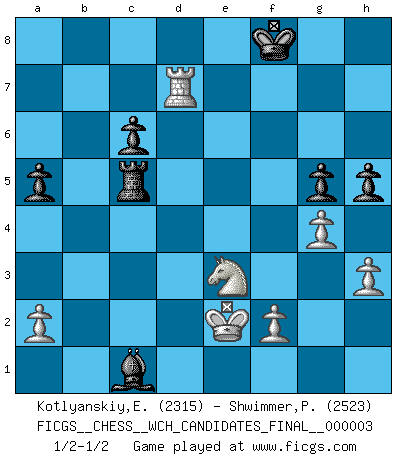 Last move : 1/2-1/2 2009 April 5 17:46:56 [Event "FICGS__CHESS__WCH_CANDIDATES_FINAL__000003"] [Site "FICGS"] [Date "2009.02.01"] [Round "4"] [White "Kotlyanskiy,Edward"] [Black "Shwimmer,Peter"] [Result "1/2-1/2"] [WhiteElo "2315"] [BlackElo "2523"] 1.e4 c5 2.Nf3 d6 3.d4 cxd4 4.Nxd4 Nf6 5.Nc3 a6 6.Be3 Ng4 7.Bg5 h6 8.Bh4 g5 9.Bg3 Bg7 10.h3 Ne5 11.Nf5 Bxf5 12.exf5 Nbc6 13.Nd5 e6 14.fxe6 fxe6 15.Ne3 O-O 16.Be2 d5 17.O-O Ng6 18.c4 d4 19.Qc2 Nge7 20.Rfd1 Qe8 21.Nf1 Nf5 22.Bh2 Rd8 23.Qe4 Qf7 24.Rd2 Nd6 25.Bxd6 Rxd6 26.Bd3 Qf5 27.Qe2 Qe5 28.Re1 Qxe2 29.Rdxe2 Nb4 30.Bb1 a5 31.c5 Rc6 32.Rxe6 d3 33.Rxc6 bxc6 34.Rd1 Bxb2 35.Bxd3 Nxd3 36.Rxd3 Rf5 37.Rd8+ Kf7 38.Rd7+ Kf8 39.Ne3 Rxc5 40.Kf1 Bc1 41.Ke2 h5 42.g4 1/2-1/2 Sicilian : Najdorf, Byrne (English) attack Kingside Castling by player Black (move 15) Kingside Castling by player White (move 17) This chess game ended in a draw. Follow this game move after move (download)Chess mastery essentially consists of analyzing Chess positions accurately. (Mikhail Botvinnik) Ich verlor meine Bürgerrechte, mein Gehalt wurde mir nicht mehr bezahlt und ich wurde zensiert und durfte nicht mehr ins Ausland reisen. [nach dem Match Fischer-Taimanov 6:0] (Mark Taimanov) Observen a Garry Kasparov. Después de una derrota, invariablemente el gana la próxima partida. Prácticamente hace pedazos a su siguiente oponente. Eso es algo que tenemos que aprender a lograr. (Maurice Ashley) Je menace de comprendre la position. (Anonyme) I can't decide which is riskier; taking crazy risks, or taking advice on crazy risks from a crazy risk taker. (Gregory House in House M.D.)