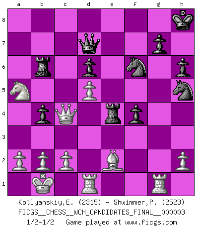 Last move : 1/2-1/2 2009 March 29 18:48:31 [Event "FICGS__CHESS__WCH_CANDIDATES_FINAL__000003"] [Site "FICGS"] [Date "2009.02.01"] [Round "6"] [White "Kotlyanskiy,Edward"] [Black "Shwimmer,Peter"] [Result "1/2-1/2"] [WhiteElo "2315"] [BlackElo "2523"] 1.e4 c5 2.Nf3 d6 3.d4 cxd4 4.Nxd4 Nf6 5.Nc3 a6 6.f3 e5 7.Nb3 Be6 8.Be3 Be7 9.Qd2 O-O 10.O-O-O Nbd7 11.g4 b5 12.Rg1 b4 13.Nd5 Bxd5 14.exd5 a5 15.g5 Nh5 16.Kb1 Rb8 17.Nc1 f5 18.gxf6 Ndxf6 19.f4 exf4 20.Bd4 Qd7 21.Qd3 Bd8 22.Rg5 h6 23.Rg1 Kh8 24.Be2 Bb6 25.Bxb6 Rxb6 26.Nb3 Re8 27.Nxa5 Re3 28.Qc4 Re4 29.Qd3 Re3 30.Qc4 Re4 1/2-1/2 Sicilian : Najdorf Kingside Castling by player Black (move 9) Queenside Castling by player White (move 10) This chess game ended in a draw. Follow this game move after move (download)Live, lose, and learn, by observing your opponent how to win. (Amber Steenbock) Alle offensichtlichen Züge sehen nach dem Spiel in der Analyse verdächtig aus. (Viktor Kortschnoi) Combinaciones deslumbrantes son para la mayoría, mover madera es para los pocos. (Georg Kieninger) Le joueur d'Echecs qui veut atteindre le top est obligé de développer son propre credo créatif. Alexeï Stepanovicth Souétine. Il est facile d'écrire des livres ! Ce qui est difficile, c'est de jouer ! (Alexeï Stepanovicth Souétine) A government big enough to give you everything you want is strong enough to take everything you have. (Thomas Jefferson)