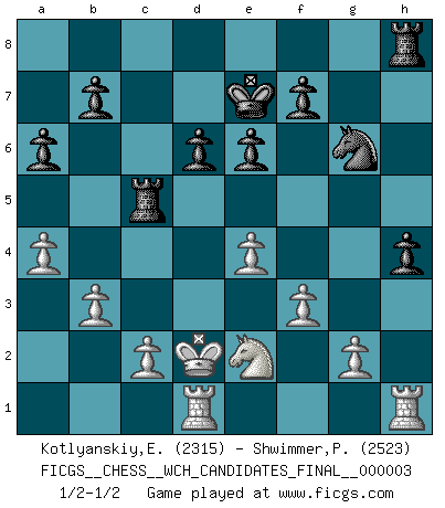 Last move : 1/2-1/2 2009 March 8 17:40:56 [Event "FICGS__CHESS__WCH_CANDIDATES_FINAL__000003"] [Site "FICGS"] [Date "2009.02.01"] [Round "8"] [White "Kotlyanskiy,Edward"] [Black "Shwimmer,Peter"] [Result "1/2-1/2"] [WhiteElo "2315"] [BlackElo "2523"] 1.e4 c5 2.Nf3 d6 3.d4 cxd4 4.Nxd4 Nf6 5.Nc3 a6 6.Be3 Ng4 7.Bg5 h6 8.Bh4 g5 9.Bg3 Bg7 10.h3 Ne5 11.f3 Nbc6 12.Bf2 Ng6 13.Qd2 Nxd4 14.Bxd4 Bxd4 15.Qxd4 Be6 16.Bc4 Bxc4 17.Qxc4 Rc8 18.Qd4 e6 19.O-O-O Ke7 20.h4 Qc7 21.Qd2 Qc5 22.hxg5 Qxg5 23.Ne2 Qxd2+ 24.Kxd2 Rc5 25.a4 h5 26.b3 h4 1/2-1/2 Sicilian : Najdorf, Byrne (English) attack Queenside Castling by player White (move 19) This chess game ended in a draw. Follow this game move after move (download)There must have been a time when men were demigods, or they could not have invented Chess. (Gustav Schenk) Wer der Ansicht ist, daß alle Schachspieler verrückt sind, wird durch Studium des Lebens von Emil Josef Diemer nicht auf andere Gedanken kommen. (Hans Ree) La mitad de las variaciones que son calculadas en una partida de torneo, resultan ser completamente superfluas. Desafortunadamente, nadie sabe por adelantado cual mitad. (Jan Tinman) Aux échecs, l'amour-propre est satisfait quand on remporte la victoire, mais il n'y a pas de honte à être battu. (Benjamin Franklin) . 'gn is not allowed in chess unless n is an integer between 1 and 8 inclusive, where 1 and 8 are to interpreted as the standard numerals standing for integers in the ordered real-closed field R, with the *canonical* ordering. (As opposed to, say, an integer in the domain Z[2+i*sqrt(5)] or an integer in some exotic Grothendieck topos). (Normajean Yates)