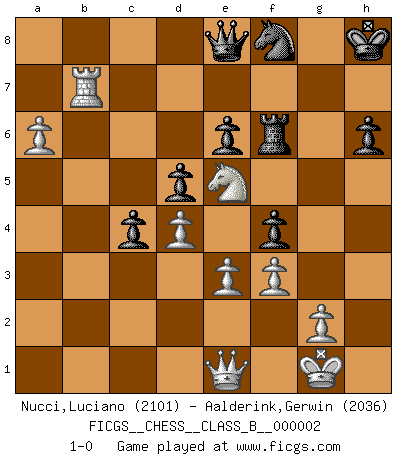Last move : 1-0 2006 December 28 13:17:7 [Event "FICGS__CHESS__CLASS_B__000002"] [Site "FICGS"] [Date "2006.04.16"] [Round "1"] [White "Nucci,Luciano"] [Black "Aalderink,Gerwin"] [Result "1-0"] [WhiteElo "2101"] [BlackElo "2036"] 1.d4 d5 2.Nf3 c6 3.Bf4 Nf6 4.e3 Bg4 5.Be2 e6 6.Nbd2 Nbd7 7.O-O Be7 8.h3 Bh5 9.c4 Qb6 10.b3 O-O 11.c5 Qd8 12.b4 Qc8 13.Bd3 Rd8 14.a4 Nf8 15.Qc2 Bg6 16.b5 Bxd3 17.Qxd3 Ng6 18.Bh2 Nd7 19.Rfc1 Re8 20.bxc6 bxc6 21.Rab1 f5 22.Rb3 Rf8 23.Rcb1 Bd8 24.Bd6 Rf7 25.Qe2 Be7 26.h4 Bxd6 27.cxd6 c5 28.Ng5 Rf6 29.Rb7 c4 30.Rc7 Qe8 31.Ndf3 Rd8 32.h5 Ngf8 33.Ne5 h6 34.Ngf3 Qxh5 35.Qe1 Nxe5 36.Nxe5 Rxd6 37.R1b7 Rb6 38.Rxg7+ Kh8 39.Rxa7 Rb2 40.f3 Rb8 41.Rgb7 Rxb7 42.Rxb7 f4 43.a5 Qe8 44.a6 1-0 Queen's pawn game Kingside Castling by player White (move 7) Kingside Castling by player Black (move 10) Player White won this chess game. Follow this game move after move (download)As one by one I mowed them down, my superiority soon became apparent. (Jose Capablanca) Bis jetzt ist Weiß einer wohlbekannten Analyse gefolgt. Aber jetzt begeht er einen schrecklichen Fehler: Er beginnt seinen eigenen Kopf zu benutzen. (Siegbert Tarrasch) Los errores estan ahí, esperando a que se cometan. (Savielly Tartakower) Votre prénom est 'Tactique', votre deuxième prénom est 'Tactique' et votre nom est 'Tactique'. (Ken Smith) When I took office, only high energy physicists had ever heard of what is called the World Wide Web... Now even my cat has its own page. (Bill Clinton, 1996)