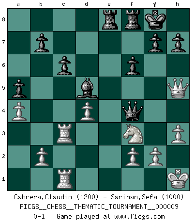 Last move : 0-1 2007 January 5 4:9:52 [Event "FICGS__CHESS__THEMATIC_TOURNAMENT__000009"] [Site "FICGS"] [Date "2006.08.27"] [Round "1"] [White "Cabrera,Claudio"] [Black "Sarihan,Sefa"] [Result "0-1"] [WhiteElo "1200"] [BlackElo "1000"] 1.d4 Nf6 2.Bg5 d5 3.Nf3 e6 4.e3 Be7 5.c4 dxc4 6.Bxc4 O-O 7.O-O Nbd7 8.Nc3 Nb6 9.Bb3 a5 10.a4 Nfd5 11.Bxe7 Qxe7 12.Rc1 Nxc3 13.Rxc3 Nd5 14.Bxd5 exd5 15.Ne5 f6 16.Nf3 c6 17.h3 Qb4 18.Qc2 Be6 19.Rc1 Qe7 20.e4 dxe4 21.Qxe4 Qd6 22.Kh1 Rae8 23.Qh4 Bd5 24.Qh5 Qf4 0-1 This chess game has been lost on time (started : 2006.08.27 0:26:25) Trompowsky attack (Ruth, Opovcensky Opening) Kingside Castling by player Black (move 6) Kingside Castling by player White (move 7) Player Black won this chess game. Follow this game move after move (download)Before the endgame, the Gods have placed the middle game. (Siegbert Tarrasch) Ich brauche nur einen Blick auf das Schachbrett zu werfen, und weiß schon, was in der Stellung steckt, was geschehen kann und was geschehen wird. Alle übrigen suchen und prüfen, ich aber weiß es! (José Raúl Capablanca) En manos de Fischer's, una diminuta ventaja teórica es tan buena como tener una Reina de ventaja. (Isaac Kashdan) Le jeu d'échecs est comme rejeté hors du temps. (Antoine de Saint-Exupéry) Life is pain my dear and anyone who says otherwise is selling something. (Princess Bride)