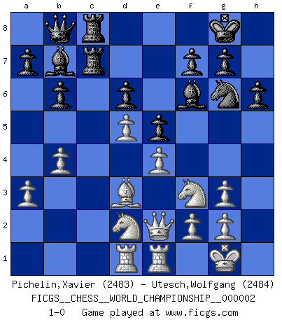 Last move : 1-0 2009 April 30 11:31:35 [Event "FICGS__CHESS__WORLD_CHAMPIONSHIP__000002"] [Site "FICGS"] [Date "2009.02.01"] [Round "5"] [White "Pichelin,Xavier"] [Black "Utesch,Wolfgang"] [Result "1-0"] [WhiteElo "2483"] [BlackElo "2484"] 1.d4 Nf6 2.Nf3 e6 3.Bf4 b6 4.e3 Bb7 5.Nbd2 Be7 6.Bd3 Nh5 7.Bg3 d6 8.Qe2 c5 9.c3 O-O 10.e4 h6 11.O-O cxd4 12.cxd4 Nc6 13.a3 Bf6 14.Qe3 Nxg3 15.hxg3 Rc8 16.Rac1 Re8 17.b4 Rc7 18.Nb3 Qb8 19.Rfe1 Rec8 20.Rcd1 e5 21.d5 Ne7 22.Nbd2 Ng6 23.Qe2 1-0 Queen's pawn game Kingside Castling by player Black (move 9) Kingside Castling by player White (move 11) Player White won this chess game. Follow this game move after move (download)Alekhine is a poet who creates a work of art out of something that would hardly inspire another man to send home a picture post card. (Max Euwe) Es ist peinlich, dass ich nie Weltmeister wurde. Es wäre leicht, Leonid Breschnjew als Ursache vorzuschieben, dessen Apparat den Vorzeigekommunisten Anatoli Karpow in allem unterstützte. Aber Garri Kasparow zum Beispiel, der ebenfalls von den Sowjets unerwünscht war, hat trotz der Widerstände den WM-Titel erobert. (Viktor Kortschnoi) El Ajedrez es imaginación. (David Bronstein) Dieu déplace le joueur, et celui-ci la pièce. Quel Dieu derrière Dieu commence donc la trame ? Arturo Perez-Reverte (prix de littérature policière 1993). Locking firmely the window serves nothing, only small thiefs pass through there, the big thiefs enter through the front door. (Luc-Olivier Leclerc)