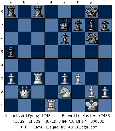 Last move : 0-1 2009 April 30 11:31:52 [Event "FICGS__CHESS__WORLD_CHAMPIONSHIP__000002"] [Site "FICGS"] [Date "2009.02.01"] [Round "8"] [White "Utesch,Wolfgang"] [Black "Pichelin,Xavier"] [Result "0-1"] [WhiteElo "2484"] [BlackElo "2483"] 1.c4 Nf6 2.d4 e6 3.Nf3 b6 4.a3 Bb7 5.Nc3 d5 6.Bg5 Be7 7.Qa4+ Bc6 8.Qb3 O-O 9.e3 Nbd7 10.Be2 Bb7 11.O-O c5 12.Rfd1 Ne4 13.Bxe7 Qxe7 14.cxd5 Nxc3 15.Qxc3 Bxd5 16.b4 cxd4 17.Nxd4 Rfc8 18.Qb2 a5 19.f3 Ne5 20.bxa5 bxa5 21.Rac1 Bc4 22.Rc3 Bxe2 23.Nxe2 Ng6 0-1 English, 1...Nf6 (Anglo-Indian defense) Kingside Castling by player Black (move 8) Kingside Castling by player White (move 11) Player Black won this chess game. Follow this game move after move (download)It is not enough to be a good player... you must also play well. (Siegbert Tarrasch) Modernes Schach sorgt sich zuviel um Dinge wie Bauernstruktur usw. Vergessen Sie das, Schachmatt beendet das Spiel! (Nigel Short) Tu eres para mi la Reina en d8 y yo soy el Peón en d7!!. (GM Eduard Gufeld) D'abord les bases : Jouez et étudiez, puis étudiez et jouez, ensuite jouez et étudiez, puis étudiez et jouez. Deuxièmement : Donnez toujours le meilleur de vous-même ! (Ken Smith) A computer lets you make more mistakes faster than any invention in human history - with the possible exceptions of handguns and tequila. (Mitch Ratcliffe)