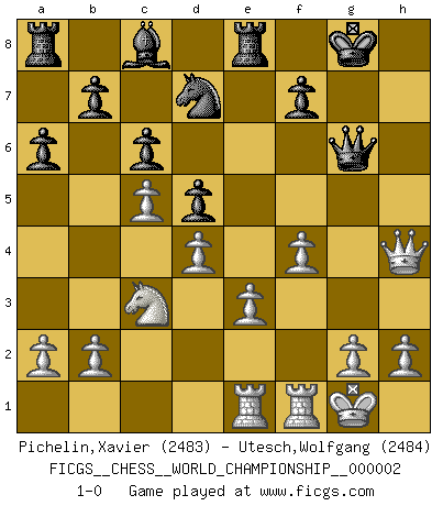 Last move : 1-0 2009 April 30 11:32:9 [Event "FICGS__CHESS__WORLD_CHAMPIONSHIP__000002"] [Site "FICGS"] [Date "2009.02.01"] [Round "11"] [White "Pichelin,Xavier"] [Black "Utesch,Wolfgang"] [Result "1-0"] [WhiteElo "2483"] [BlackElo "2484"] 1.Nf3 d5 2.d4 Nf6 3.c4 c6 4.Nc3 a6 5.c5 Nbd7 6.Bf4 Nh5 7.Bd2 Nhf6 8.Qc2 g6 9.Bg5 Bg7 10.e3 O-O 11.Be2 Re8 12.O-O e5 13.Rae1 h6 14.Bh4 g5 15.Bg3 Nh5 16.Bxe5 g4 17.Bxg7 gxf3 18.Bxh6 fxe2 19.Qxe2 Qh4 20.f4 Ng3 21.Qf2 Qxh6 22.Qxg3+ Qg6 23.Qh4 1-0 Reti Opening Kingside Castling by player Black (move 10) Kingside Castling by player White (move 12) Player White won this chess game. Follow this game move after move (download)There is no remorse like the remorse of Chess. (H. G. Wells) Spielt Blackmar-Diemer-Gambit, und das Matt kommt von selbst! (Emil Joseph Diemer) El jugador blanco perdió porque fallo en recordar la coreccta continuación y tuvo que pensar por sí mismo las movidas. (Siegbert Tarrasch) À la honte des hommes, on sait que les lois du jeu sont les seules qui soient partout justes, claires, inviolables et exécutées. Pourquoi l'Indien qui a donné les règles du jeu d'échecs est-il obéi de bon gré dans toute la terre, et que les décrétales des papes, par exemple, sont aujourd'hui un objet d'horreur et de mépris ? C'est que l'inventeur des échecs combina tout avec justesse pour la satisfaction des joueurs, et que les papes, dans leurs décrétales, n'eurent en vue que leur seul avantage. L'Indien voulut exercer également l'esprit des hommes et leur donner du plaisir; les papes ont voulu abrutir l'esprit des hommes. Voltaire (Dictionnaire philosophique / Garnier 1967) Every vice is only an exaggeration of a necessary and virtuous function. (Ralph Waldo Emerson, Journals 1936)