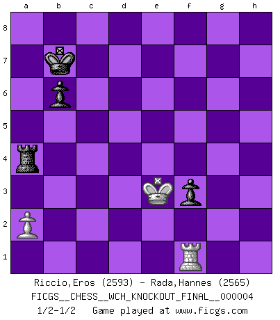 Last move : 1/2-1/2 2009 August 25 23:10:49 [Event "FICGS__CHESS__WCH_KNOCKOUT_FINAL__000004"] [Site "FICGS"] [Date "2009.02.01"] [Round "1"] [White "Riccio,Eros"] [Black "Rada,Hannes"] [Result "1/2-1/2"] [WhiteElo "2593"] [BlackElo "2565"] 1.e4 e5 2.Nf3 Nf6 3.d4 Nxe4 4.Bd3 d5 5.dxe5 Be7 6.O-O Nc5 7.Be2 O-O 8.Be3 c6 9.c4 dxc4 10.Bxc4 Nbd7 11.Nbd2 Nb6 12.Bxc5 Bxc5 13.Bb3 Bf5 14.Bc2 Qd7 15.Qb1 Bxc2 16.Qxc2 Be7 17.Ne4 Rad8 18.Rad1 Qe6 19.Neg5 Qg6 20.Qxg6 hxg6 21.g3 Na4 22.Kg2 Nc5 23.Nh3 Rxd1 24.Rxd1 Rd8 25.Re1 Kf8 26.Re2 Nd3 27.Nf4 Nxf4+ 28.gxf4 Rd5 29.Kg3 Ke8 30.Kg4 Kd7 31.e6+ fxe6 32.Ne5+ Kd6 33.Nf7+ Kc5 34.Rxe6 Bf6 35.Re2 a5 36.h4 Rd1 37.Ne5 Rg1+ 38.Kh3 Rh1+ 39.Kg3 Kb4 40.Rd2 Rg1+ 41.Kf3 Ra1 42.b3 Kc3 43.Re2 Bxh4 44.Nxg6 Bf6 45.Ne5 c5 46.Ke4 Rd1 47.Re3+ Kb4 48.Kf5 a4 49.bxa4 Kxa4 50.Re4+ Ka3 51.Rc4 b6 52.Rc2 Rd4 53.f3 Ka4 54.Rc1 Kb5 55.Ra1 Rc4 56.Rb1+ Rb4 57.Rd1 Ra4 58.Rb1+ Ka6 59.Nd7 Bd8 60.Rd1 c4 61.Nb8+ Kb7 62.Rxd8 c3 63.Rd1 Kxb8 64.Rc1 Rc4 65.Kg6 Rc7 66.Kf5 Kb7 67.Ke4 Rc4+ 68.Kd3 Rxf4 69.Rf1 g5 70.Kxc3 g4 71.Kd3 gxf3 72.Ke3 Ra4 1/2-1/2 Petrov : Modern attack, Symmetrical variation Kingside Castling by player White (move 6) Kingside Castling by player Black (move 7) 10 pieces endgame at move 63 : White KRPPP , Black KRPPP WHITE : King + 1 Rook 3 Pawns BLACK : King + 1 Rook 3 Pawns 9 pieces endgame at move 68 : White KRPP , Black KRPPP WHITE : King + 1 Rook 2 Pawns BLACK : King + 1 Rook 3 Pawns 8 pieces endgame at move 70 : White KRPP , Black KRPP WHITE : King + 1 Rook 2 Pawns BLACK : King + 1 Rook 2 Pawns 7 pieces endgame at move 71 : White KRP , Black KRPP WHITE : King + 1 Rook 1 Pawn BLACK : King + 1 Rook 2 Pawns This chess game ended in a draw. Follow this game move after move (download)The winner of the game is the player who makes the next-to-last mistake. (Savielly Tartakover) In der Schule lernt man nichts. Es ist nur Zeitverschwendung. (Robert James Fischer) En posiciones complicadas, Bobby Fischer pocas veces tuvo que temer de cualquiera. (Paul Keres) On n'a jamais que l'âge auquel on a commence à jouer aux échecs car après on cesse de vieillir. (Capablanca) Internet: Absolute communication, absolute isolation. (Paul Carvel)