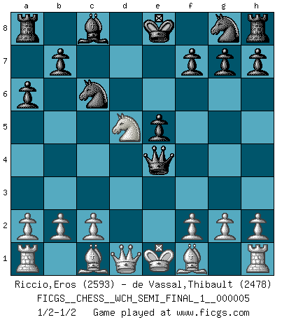 Last move : 1/2-1/2 2009 March 2 23:44:20 [Event "FICGS__CHESS__WCH_SEMI_FINAL_1__000005"] [Site "FICGS"] [Date "2009.02.01"] [Round "5"] [White "Riccio,Eros"] [Black "de Vassal,Thibault"] [Result "1/2-1/2"] [WhiteElo "2593"] [BlackElo "2478"] 1.e4 c5 2.Nf3 Nc6 3.d4 cxd4 4.Nxd4 e5 5.Nb5 a6 6.Nd6+ Bxd6 7.Qxd6 Qf6 8.Qd1 Qg6 9.Nc3 d5 10.Nxd5 Qxe4+ 1/2-1/2 Sicilian : Labourdonnais-Loewenthal variation This chess game ended in a draw. Follow this game move after move (download)A thorough understanding of the typical mating continuations makes the most complicated sacrificial combinations leading up to them not only not difficult, but almost a matter of course. (Siegbert Tarrasch) Der zweitbeste Zug ist oft der einzig richtige. (Savielly Grigorievitsch Tartakower) La estratégia requiere pensar, la táctica requiere observación. (Max Euwe) Seul un grand joueur sait à quel point il joue faiblement. (Xavier Tartacover) If you don't practice you don't deserve to win. (Andre Agassi)