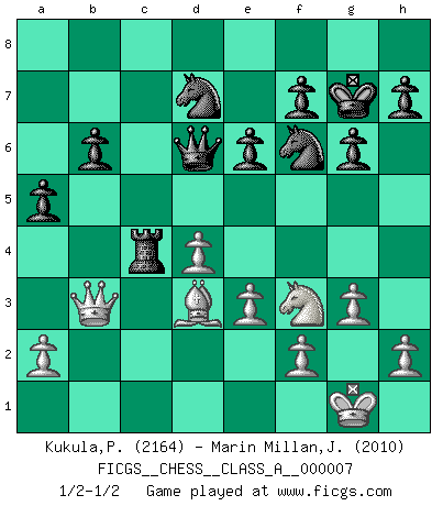 Last move : 1/2-1/2 2006 November 5 19:24:7 [Event "FICGS__CHESS__CLASS_A__000007"] [Site "FICGS"] [Date "2006.08.27"] [Round "1"] [White "Kukula,Pawel"] [Black "Marin Millan,Jose Antonio"] [Result "1/2-1/2"] [WhiteElo "2164"] [BlackElo "2010"] 1.d4 d5 2.Nf3 Nf6 3.e3 Bf5 4.c4 e6 5.Qb3 Qc8 6.Nc3 c6 7.Bd2 Nbd7 8.Rc1 Qb8 9.Nh4 Be4 10.cxd5 Bxd5 11.Nxd5 cxd5 12.Nf3 Bd6 13.Bd3 O-O 14.O-O b6 15.Bb4 Bxb4 16.Qxb4 a5 17.Qb5 Rc8 18.Rc3 Rxc3 19.bxc3 Qf8 20.g3 Qa3 21.Qc6 Qf8 22.Rc1 Rc8 23.Qa4 Qd6 24.c4 g6 25.Qb3 Kg7 26.Rc2 dxc4 27.Rxc4 Rxc4 1/2-1/2 Queen's pawn game Kingside Castling by player Black (move 13) Kingside Castling by player White (move 14) This chess game ended in a draw. Follow this game move after move (download)It was clear to me that the vulnerable point of the American Grandmaster (Bobby Fischer) was in double-edged, hanging, irrational positions, where he often failed to find a win even in a won position. (Efim Geller) Wenn du auf das Glück wartest, wird das Leben ziemlich langweilig. (Mikhail Nekhemyevich Tal) Alguna parte de un error es siempre correcto. (Savielly Tartakover) Les écrivains ont utilisé les échecs pour analyser les côtés extrêmes de la nature humaine. Dans ce cadre, les échecs offrent un champ d'expérimentation idéal. Mais on pourrait faire la même chose avec la peinture. Et là, en vous référant à Van Gogh, vous ne tirerez pas de conclusion définitive sur les peintres. (Gary Kasparov) Chess is everything: art, science and sport. (Anatoly Karpov)