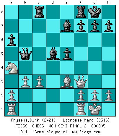 Last move : 0-1 2009 March 17 3:13:16 [Event "FICGS__CHESS__WCH_SEMI_FINAL_2__000005"] [Site "FICGS"] [Date "2009.02.01"] [Round "6"] [White "Ghysens,Dirk"] [Black "Lacrosse,Marc"] [Result "0-1"] [WhiteElo "2421"] [BlackElo "2516"] 1.e4 c5 2.Nf3 e6 3.Nc3 Nc6 4.d4 cxd4 5.Nxd4 a6 6.Be2 Qc7 7.O-O Nf6 8.Be3 Bb4 9.Na4 Be7 10.Nxc6 bxc6 11.Bb6 Qb8 12.Bd4 e5 13.Be3 d5 14.exd5 Nxd5 15.Bf3 O-O 16.Bxd5 cxd5 17.Qxd5 Be6 18.Qf3 Qb5 19.b3 Rac8 20.c3 Bd5 0-1 Sicilian defense Kingside Castling by player White (move 7) Kingside Castling by player Black (move 15) Player Black won this chess game. Follow this game move after move (download)Pawn endings are to Chess what putting is to golf. (Cecil Purdy) Fischer: 'Remis!?' Uhlmann: 'Aber es muss doch dreimal Zugwiederholung sein!' Fischer: 'Sie nehmen das Remis an, wie ich es sage, sonst spiele ich weiter und werde Sie dann schlagen!' (Robert James Fischer) Aunque la mayoría de la gente disfruta observar las partidas de los grandes Maestros de ataque, algunos de los jugadores mas notables en la historia han sido los jugadores silenciosos posicionales. Lentamente ellos te aplastan despojandote de tu espacio, congestionando tus piezas y dejandote virtualmente sin nada que hacer. (Yasser Seirawan) Si le désir cupide (et stupide) de gagner est une inépuisable source de souffrance, une combinaison brillante sur l'échiquier est une découverte : le coquelicot qui s'épanouit lorsque apparaît la Voie Lactée. (Arrabal) Big Chess is a place for big hallucinations. (Thibault de Vassal)