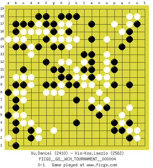 Last move : 0-1 2009 May 22 8:50:34 [Event "FICGS__GO__WCH_TOURNAMENT__000004 "] [Site "FICGS"] [Date "2009.02.02"] [Round "1"] [Black "Xu,Daniel "] [White "Kis-Kos,Laszlo "] [Result "0-1"] [Rating 1 "2410"] [Rating 2 "2562"] 1.r16 d4 2.q3 d16 3.f17 h17 4.c14 f16 5.c17 c16 6.d17 e17 7.e18 e16 8.f18 d10 9.b16 b15 10.b17 c15 11.k4 r6 12.r9 r3 13.r4 q4 14.p4 q5 15.r2 s3 16.p3 s2 17.o6 p17 18.q14 r17 19.s17 q16 20.r15 g3 21.b4 c4 22.b3 b5 23.d2 e2 24.d3 e3 25.b1 a2 26.b6 c5 27.a5 c7 28.b7 c8 29.b9 b8 30.a8 b10 31.c9 d9 32.m17 r18 33.g14 h15 34.m15 s18 35.h14 k15 36.b14 a15 37.c11 c10 38.e14 j14 39.f12 o15 40.m13 j12 41.h11 h12 42.g11 o13 43.p12 o12 44.m11 k10 45.k18 h9 46.g9 g8 47.f9 f8 48.h10 d13 49.j9 h8 50.j10 d14 51.j16 j15 52.g16 g15 53.f15 h16 54.g17 l12 55.m12 o10 56.p11 o11 57.k9 l10 58.l11 k11 59.m10 l9 60.k7 m9 61.n9 n8 62.h18 j17 63.j18 n6 64.n5 o7 65.m6 n10 66.p9 o9 67.l13 m7 0-1 Here are the names of the openings (joseki) played in the four corners : Corner d16 : d16 f17Hoshi (Hwajeom, Seongjeom, Xingwei`) 4-4 Point. The star or hoshi (4-4) point, emphasizing influence at the potential expense of territory.Ikken Kakari (Hankan Keolch'im, Yi Gua`jiao~, 1-Space Low Approach). Black 2 is the standard approach move to the 4-4. Corner q4 : q3 r6Komoku (Somok, Xiao~mu`) 3-4 Point. The komoku (3-4) point is the traditional corner enclosure move..Nikken Kakari (Dukan Keolch'im, E`r Gua`jiao~, 2-Space Low Approach). White 2 is used with friendly forces backing it up. Its purpose is to prevent a pincer. Locally it results in a loss, but may be appropriate fuseki strategy. It was popular in the late 1950s and early 1960s, but is not seen often nowadays, having been replaced by the one-space high approach, with which it has points in common. Corner q16 : r16 p17Komoku (Somok, Xiao~mu`) 3-4 Point. The komoku (3-4) point is the traditional corner enclosure move..Ikken Kakari (Hankan Keolch'im, Yi Gua`jiao~, 1-Space Low Pincer). The small knight move is the basic approach move to the 3-4 point stone. It has been continually used for over four centuries. There are limitless variations, with new moves constantly being discovered. White 2 opens the door to a treaure store of joseki. Player White won this Go (weiqi, baduk) game.Follow this game move after move (download ) If you cannot succeed, then die gloriously. (Chinese proverb) Plans are ideas that never come to fruition. (Daniel Parmet)
