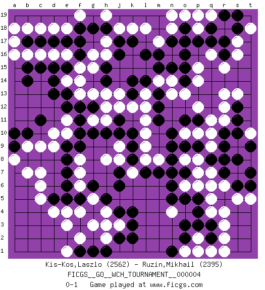 Last move : 0-1 2009 September 2 2:45:57 [Event "FICGS__GO__WCH_TOURNAMENT__000004"] [Site "FICGS"] [Date "2009.02.02"] [Round "1"] [Black "Kis-Kos,Laszlo"] [White "Ruzin,Mikhail"] [Result "0-1"] [Rating 1 "2562"] [Rating 2 "2395"] 1.r16 d16 2.q3 d4 3.p17 q5 4.q8 n4 5.p5 p6 6.o5 q4 7.o3 r3 8.p3 o6 9.n5 r2 10.f3 c6 11.k4 r6 12.f17 h17 13.c17 c16 14.d17 e16 15.f18 g15 16.c11 c9 17.d14 e14 18.e13 f14 19.d13 e10 20.g12 f13 21.f12 e11 22.e12 j13 23.g10 f8 24.j11 n16 25.l16 m17 26.l14 l13 27.m13 m14 28.m15 n14 29.k13 l12 30.k14 k12 31.n15 k18 32.o14 n13 33.o16 j12 34.m12 o13 35.m11 p14 36.o15 o10 37.k10 l11 38.n10 l10 39.o9 p10 40.n8 r13 41.r10 q9 42.r9 p8 43.p9 q10 44.r7 o8 45.n9 q7 46.r8 r11 47.s11 r12 48.s12 s13 49.o11 p12 50.s6 s5 51.t6 t10 52.s10 t8 53.t9 s9 54.s8 t5 55.t9 q16 56.q17 r15 57.t7 s16 58.r17 l8 59.n6 n7 60.o7 p7 61.m7 h11 62.h10 h12 63.f10 h8 64.k9 l9 65.e9 d10 66.f9 d9 67.e8 f7 68.e7 f6 69.b14 b16 70.b17 a17 71.f16 b18 72.e17 c18 73.e15 f15 74.d15 d18 75.h18 j18 76.g18 e18 77.b15 a18 78.j17 h16 79.k17 l18 80.h14 g16 81.c15 a16 82.h15 f19 83.j7 k7 84.j6 m8 85.o7 j8 86.k8 n7 87.l7 q6 88.o7 j9 89.j10 n7 90.p11 q11 91.o7 g11 92.f11 n7 93.j16 h19 94.o7 g13 95.n7 h13 96.e6 f4 97.e5 e4 98.f5 g5 99.g4 h4 100.g6 g3 101.h5 j3 102.k3 c7 103.j2 h2 104.j4 h3 105.k2 s17 106.s18 t18 107.s19 p15 108.n17 n18 109.o17 q19 110.m16 o1 111.q2 q1 112.p1 p2 113.o2 p1 114.n1 r1 115.h1 f2 116.f1 e1 117.g1 e3 118.b10 b9 119.o18 o19 120.p19 p18 121.q18 p19 122.r19 n19 123.a9 a8 124.a10 b7 125.p4 r4 126.d5 c5 0-1 Here are the names of the openings (joseki) played in the four corners : Corner q4 : q3 q5 Komoku (Somok, Xiao~mu`) 3-4 Point. The komoku (3-4) point is the traditional corner enclosure move.. Ikken Takagakari (Hankan Nop'dakeolch'im, Yi Gaogua`jiao~, 1-Space High Approach). The 5-4 approach move has become more popular in modern times, as modern Go emphasizes speed and influence. Corner d4 : d4 f3 Hoshi (Hwajeom, Seongjeom, Xingwei`) 4-4 Point. The star or hoshi (4-4) point, emphasizing influence at the potential expense of territory. Ikken Kakari (Hankan Keolch'im, Yi Gua`jiao~, 1-Space Low Approach). Black 2 is the standard approach move to the 4-4. Corner d16 : d16 f17 Hoshi (Hwajeom, Seongjeom, Xingwei`) 4-4 Point. The star or hoshi (4-4) point, emphasizing influence at the potential expense of territory. Ikken Kakari (Hankan Keolch'im, Yi Gua`jiao~, 1-Space Low Approach). Black 2 is the standard approach move to the 4-4. Player White won this Go (weiqi, baduk) game. Follow this game move after move (download)The simplest move is the best move. (Anonymous) After growing wildly for years, the field of computing appears to be reaching its infancy. (John Pierce)