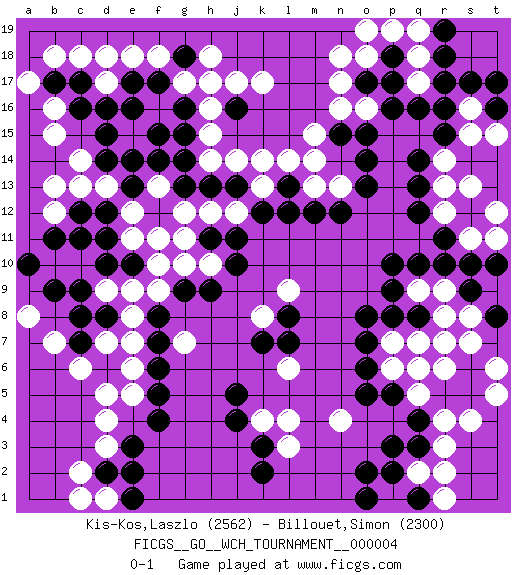 Last move : 0-1 2009 July 6 4:3:45 [Event "FICGS__GO__WCH_TOURNAMENT__000004"] [Site "FICGS"] [Date "2009.02.02"] [Round "1"] [Black "Kis-Kos,Laszlo"] [White "Billouet,Simon"] [Result "0-1"] [Rating 1 "2562"] [Rating 2 "2300"] 1.r16 d17 2.q3 d3 3.p17 q5 4.q8 n4 5.p5 p6 6.o5 r3 7.q4 r4 8.r5 q6 9.s5 q2 10.p2 r2 11.p3 r6 12.s6 s7 13.r7 s8 14.o6 p7 15.s9 r9 16.o8 r8 17.p8 q7 18.o7 r7 19.f4 d5 20.j4 c10 21.e3 d4 22.f6 d7 23.f8 k4 24.k3 l4 25.j5 l3 26.k2 l6 27.l8 g7 28.f7 k8 29.k7 l9 30.l7 k17 31.d15 f16 32.c17 c18 33.c16 b18 34.c12 n17 35.r11 s16 36.r15 s15 37.s17 r14 38.q14 r13 39.q13 r12 40.q12 s11 41.s12 s13 42.s10 t12 43.r10 q9 44.p10 c14 45.d14 c13 46.d12 d13 47.e13 b12 48.b11 b13 49.c11 e12 50.d10 b15 51.f14 f13 52.e14 e11 53.c9 b16 54.b17 a17 55.g13 g11 56.f12 f11 57.j13 e9 58.d8 e8 59.c7 d9 60.c8 e7 61.h9 c6 62.d11 b10 63.b9 b7 64.e10 f9 65.g9 f10 66.a10 a8 67.h11 l14 68.h17 h16 69.j16 j17 70.g16 h15 71.g15 g17 72.f17 h18 73.g18 h17 74.e16 f18 75.e17 e18 76.l12 o18 77.d2 c2 78.e2 p1 79.q1 r1 80.o2 q18 81.p18 p19 82.o17 n18 83.r18 q17 84.q16 n16 85.o15 m13 86.m12 n13 87.n12 h10 88.j10 h12 89.j11 g12 90.h13 j12 91.k12 d1 92.e1 c1 93.o13 h14 94.g14 k13 95.f15 j14 96.l13 k14 97.n15 m15 98.o14 m14 99.r17 q19 100.r19 o19 101.o1 e5 102.f5 o16 103.p16 g10 104.p9 s4 105.q10 t5 106.t16 t15 107.t17 e6 108.t8 t6 109.q1 f13 110.t10 t11 111.d16 d18 0-1 Here are the names of the openings (joseki) played in the four corners : Corner q4 : q3 q5 Komoku (Somok, Xiao~mu`) 3-4 Point. The komoku (3-4) point is the traditional corner enclosure move.. Ikken Takagakari (Hankan Nop'dakeolch'im, Yi Gaogua`jiao~, 1-Space High Approach). The 5-4 approach move has become more popular in modern times, as modern Go emphasizes speed and influence. Corner d4 : d3 f4 Komoku (Somok, Xiao~mu`) 3-4 Point. The komoku (3-4) point is the traditional corner enclosure move.. Corner d16 : d17 d15 Komoku (Somok, Xiao~mu`) 3-4 Point. The komoku (3-4) point is the traditional corner enclosure move.. Ikken Takagakari (Hankan Nop'dakeolch'im, Yi Gaogua`jiao~, 1-Space High Approach). The 5-4 approach move has become more popular in modern times, as modern Go emphasizes speed and influence. Player White won this Go (weiqi, baduk) game. Follow this game move after move (download)If you have won four corners, resign. (Anonymous) Life is verb, not a noun. (Charlotte Perkins Gilman)