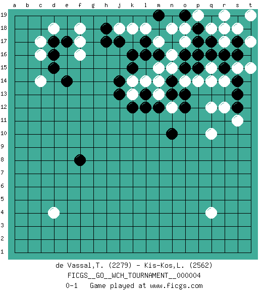 Last move : 0-1 2009 May 16 21:31:8 [Event "FICGS__GO__WCH_TOURNAMENT__000004"] [Site "FICGS"] [Date "2009.02.02"] [Round "1"] [Black "de Vassal,Thibault"] [White "Kis-Kos,Laszlo"] [Result "0-1"] [Rating 1 "2279"] [Rating 2 "2562"] 1.q16 d4 2.d16 q4 3.k16 c14 4.e14 c17 5.d17 c16 6.k15 q14 7.o15 q10 8.r15 r14 9.k12 o17 10.p18 f16 11.d15 k18 12.j17 j18 13.h18 o18 14.p17 f18 15.h17 n15 16.o16 n16 17.n14 m17 18.l17 l18 19.m19 n18 20.m16 m15 21.l16 m14 22.n13 m13 23.m12 k13 24.j13 k14 25.j14 n12 26.l12 o14 27.o13 p14 28.o12 p16 29.p15 q15 30.p16 r17 31.r16 q18 32.s14 q12 33.s13 r12 34.s17 s18 35.s16 p19 36.t18 t15 37.s12 s11 38.s19 r18 39.q19 r19 40.q17 t19 41.o19 t17 42.l13 s15 43.n10 l14 44.f8 d18 45.e17 f17 0-1 Here are the names of the openings (joseki) played in the four corners : Corner d16 : d16 c14 Hoshi (Hwajeom, Seongjeom, Xingwei`) 4-4 Point. The star or hoshi (4-4) point, emphasizing influence at the potential expense of territory. Ikken Kakari (Hankan Keolch'im, Yi Gua`jiao~, 1-Space Low Approach). White 2 is the standard approach move to the 4-4. Corner q16 : q16 q14 Hoshi (Hwajeom, Seongjeom, Xingwei`) 4-4 Point. The star or hoshi (4-4) point, emphasizing influence at the potential expense of territory. Ikken Takagakari (Hankan Nop'dakeolch'im, Yi Gaojia, 1-Space High Approach). Black typically responds at 6-4 or 3-10. Black 4-10 is played when Black finds play on the right side advantageous. Black 4-8 or 3-8 may be played when Black has support at top. Corner d4 : d4 f8 Hoshi (Hwajeom, Seongjeom, Xingwei`) 4-4 Point. The star or hoshi (4-4) point, emphasizing influence at the potential expense of territory. Player White won this Go (weiqi, baduk) game. Follow this game move after move (download)The comb formation is alive. (Anonymous) Wisdom is the reward you get for a lifetime of listening when you'd have preferred to talk. (Doug Larson)